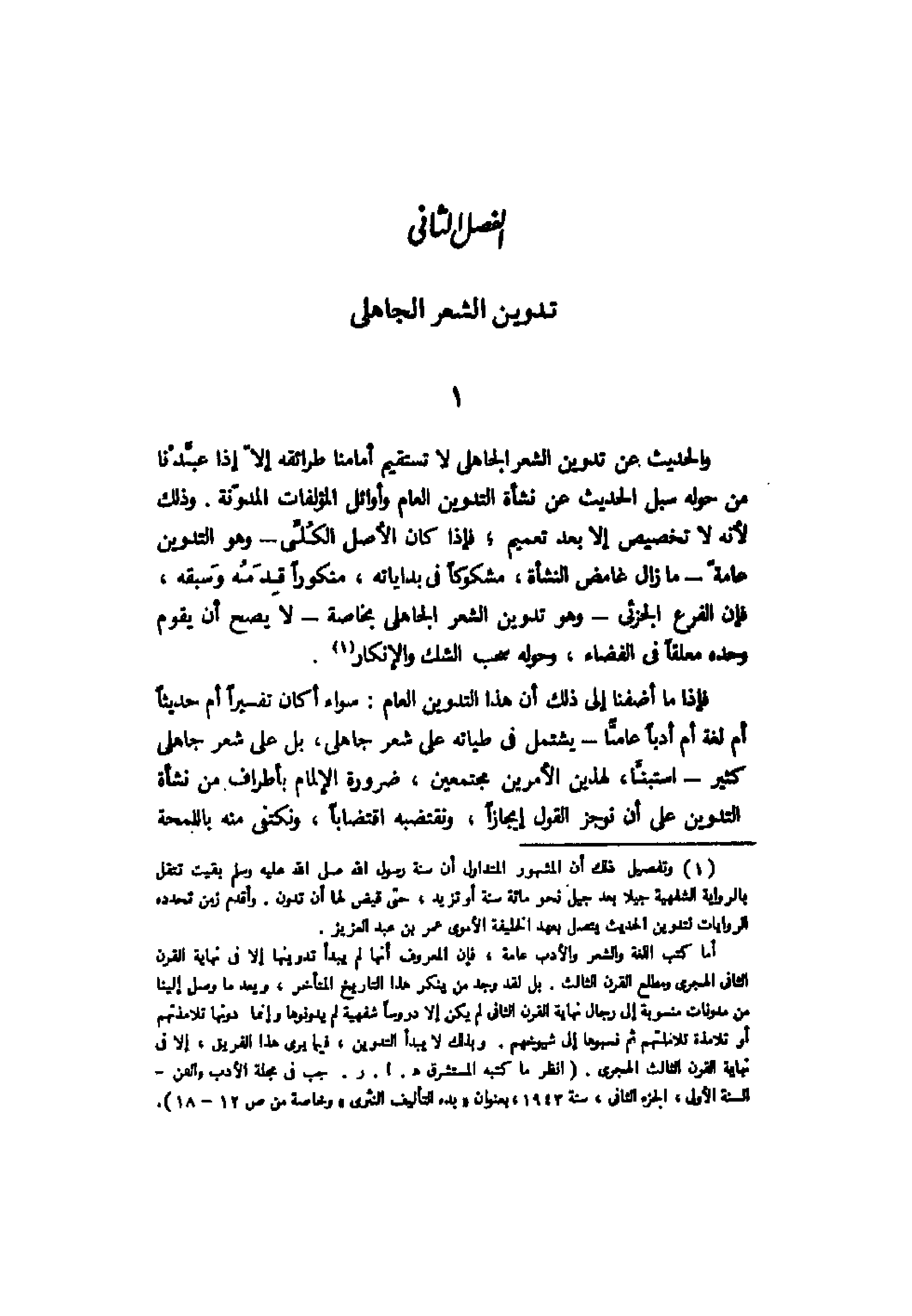 فإذا أضفنا إلى ذلك أن هذا التدوين العام: سواء أكان تفسيرًا حديثًا أم لغة أم أدبًا عامًا -يشتمل في طياته على شعر جاهلي، بل على شعر جاهلي كثير- استبنَّا، لهذين الأمرين مجتمعين، ضرورة الإلمام بأطراف من نشأة التدوين على أن نوجز القول إيجازًا، ونقتضبه اقتضابًا، ونكتفي منه باللمحة