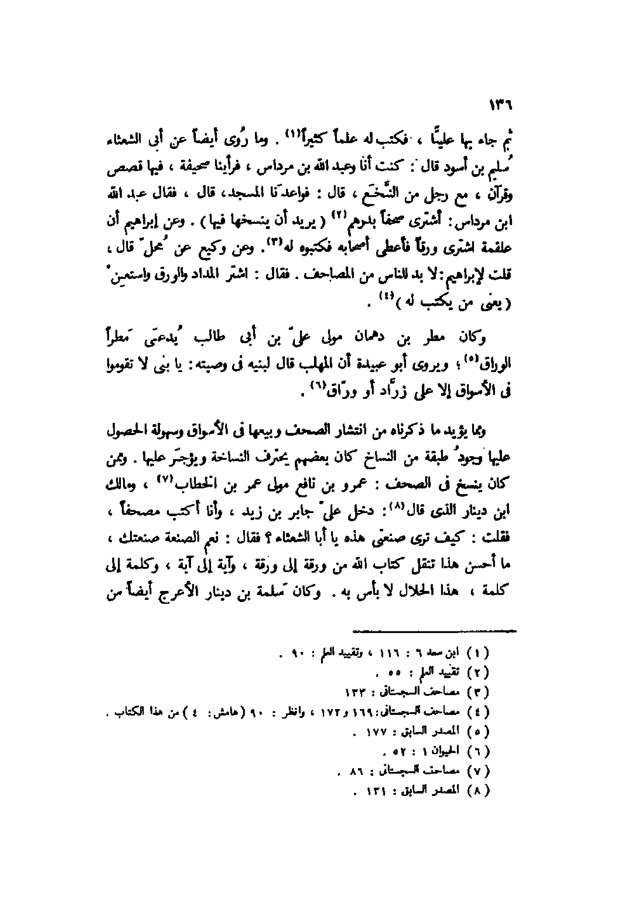 ثم جاء بها عليًّا، فكتب له علمًا كثيرًا1. وما رُوي أيضًا عن أبي الشعثاء سليم بن أسود قال: كنت أنا وعبد الله بن مرداس، فرأينا صحيفة، فيها قصص وقرآن، مع رجل من النخع، قال: فواعدنا المسجد، قال، فقال عبد الله بن مرداس: أشتري صحفًا بدرهم2 "يريد أن ينسخها فيها". وعن إبراهيم أن علقمة اشترى ورقًا فأعطى أصحابه فكتبوه له3. وعن وكيع عن محل قال، قلت لإبراهيم: لا بد للناس من المصاحف. فقال: اشتر المداد والورق واستعن "يعني من يكتب له"4.