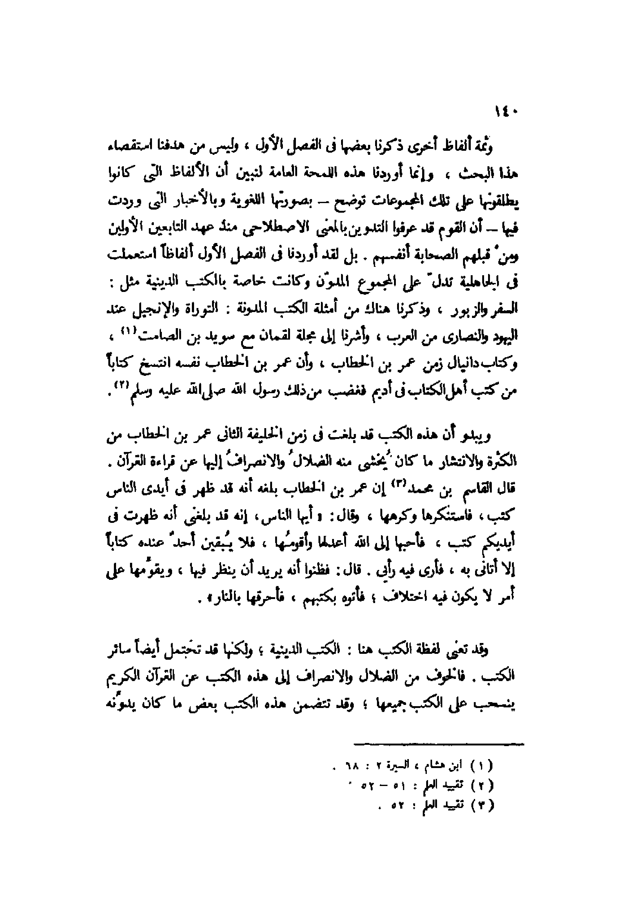 وثمة ألفاظ أخرى ذكرنا بعضها في الفصل الأول، وليس من هدفنا استقصاء هذا البحث، وإنما أوردنا هذه اللمحة العامة لنبين أن الألفاظ التي كانوا يطلقونها على تلك المجموعات توضح -بصورتها اللغوية وبالأخبار التي وردت فيها- أن القوم قد عرفوا التدوين بالمعنى الاصطلاحي منذ عهد التابعين الأولين ومن قبلهم الصحابة أنفسهم. بل لقد أوردنا في الفصل الأول ألفاظًا استعملت في الجاهلية تدل على المجموع المدون وكانت خاصة بالكتب الدينية مثل: السفر والزبور، وذكرنا هناك من أمثلة الكتب المدونة: التوراة والإنجيل عند اليهود والنصارى من العرب، وأشرنا إلى مجلة لقمان مع سويد بن الصامت1، وكتابات دانيال زمن عمر بن الخطاب، وأن عمر بن الخطاب نفسه انتسخ كتابًا من كتب أهل الكتاب في أديم فغضب من ذلك رسول الله صلى الله عليه وسلم2.