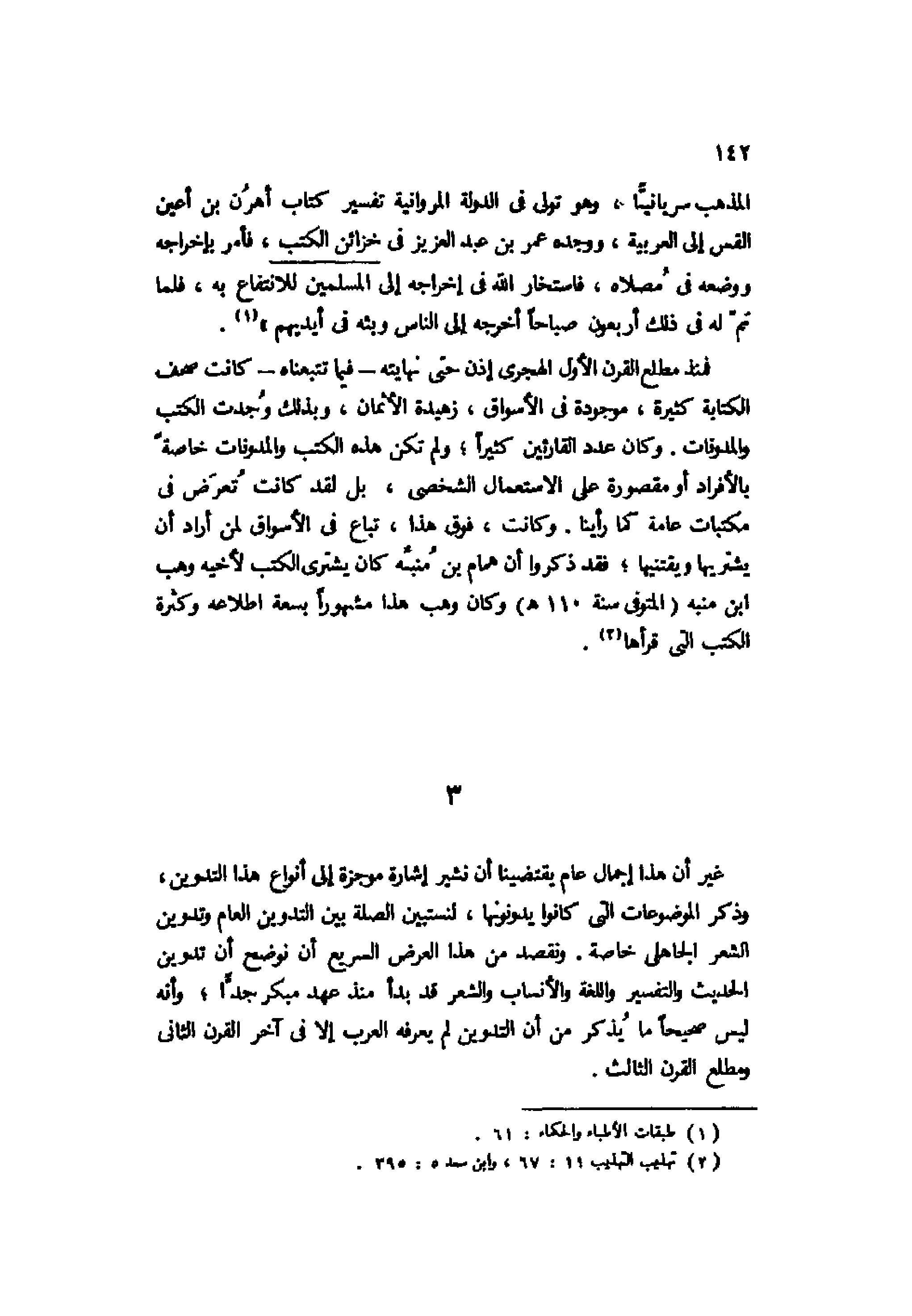 فمنذ مطلع القرن الأول الهجري إذن حتى نهايته -فيما تتبعناه- كانت صحف الكتابة كثيرة، موجودة في الأسواق، زهيدة الأثمان، وبذلك وجدت الكتب والمدونات. وكان عدد القارئين كثيرًا؛ ولم تكن هذه الكتب والمدونات خاصةً بالأفراد أو مقصورة على الاستعمال الشخصي، بل لقد كانت تُعرض في مكتبات عامة كما رأينا. وكانت، فوق هذا، تباع في الأسواق لمن أراد أن يشتريها ويقتنيها؛ فقد ذكروا أن همام بن منبه كان يشتري الكتب لأخيه وهب بن منبه "المتوفى سنة 110هـ" وكان وهب هذا مشهورًا بسعة اطلاعه وكثرة الكتب التي قرأها2.