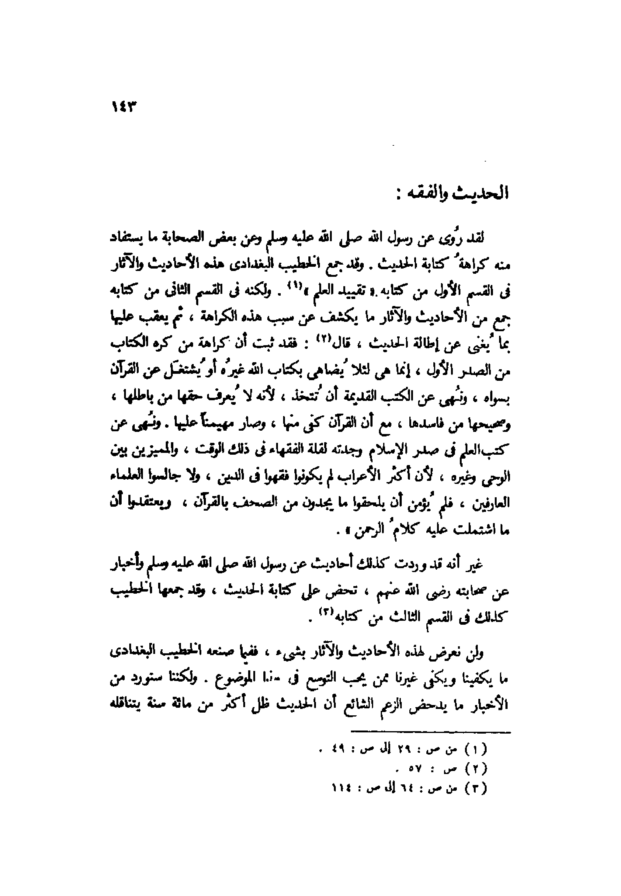 غير أنه وردت كذلك أحاديث عن رسول الله صلى الله عليه وسلم وأخبار عن صحابته رضي الله عنهم، تحض على كتابة الحديث، وقد جمعها الخطيب كذلك في القسم الثالث من كتابه3.