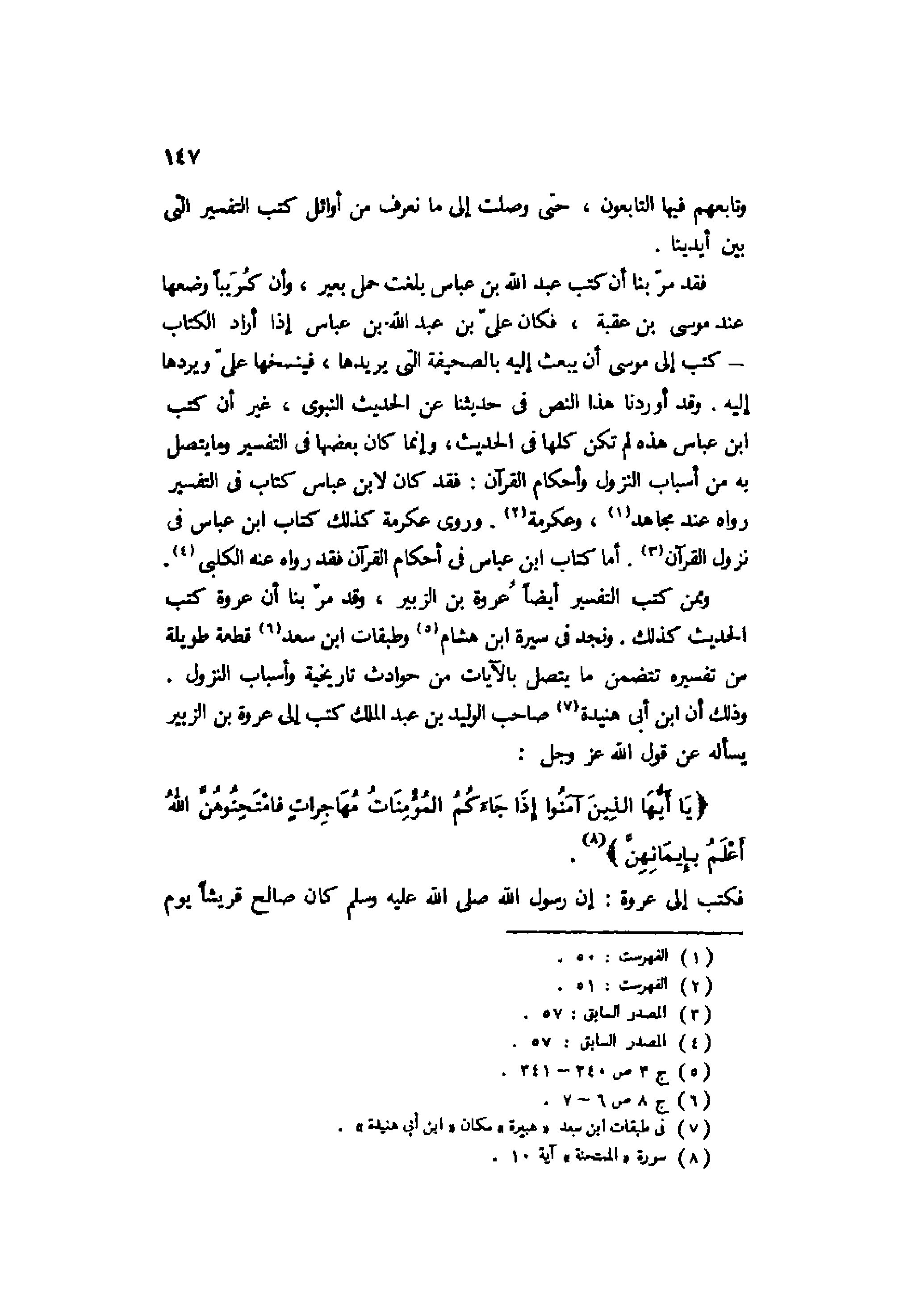 وممن كتب التفسير أيضًا عروة بن الزبير، وقد مر بنا أن عروة كتب الحديث كذلك. ونجد في سيرة ابن هشام5 وطبقات ابن سعد6 قطعة طويلة من تفسيره تتضمن ما يتصل بالآيات من حوادث تاريخية وأسباب النزول.