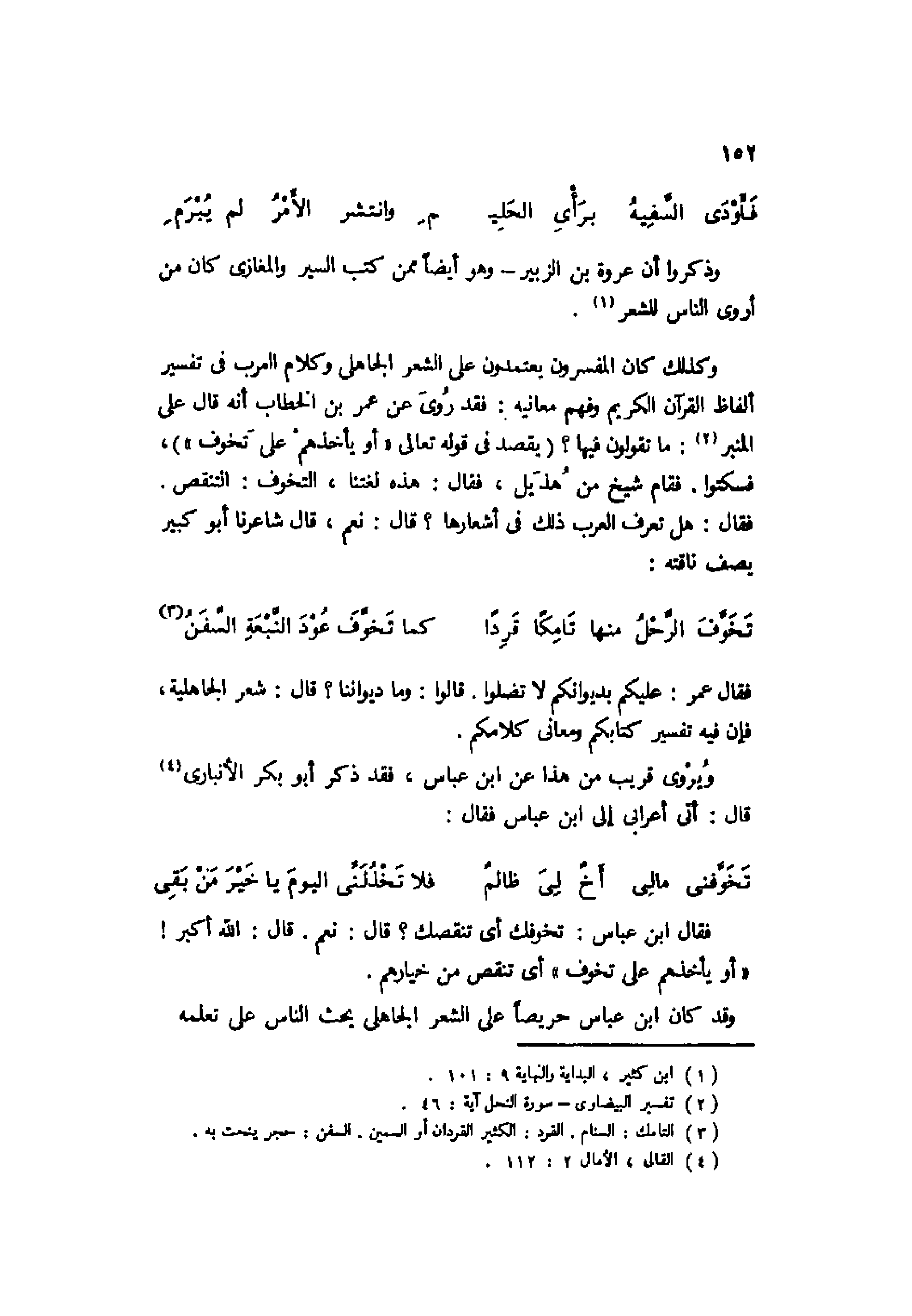 وكذلك كان المفسرون يعتمدون على الشعر الجاهلي وكلام العرب في تفسير ألفاظ القرآن الكريم وفهم معانيه: فقد رُوي عن عمر بن الخطاب أنه قال على المنبر2: ما تقولون فيها؟ "يقصد في قوله تعالى: {أَوْ يَأْخُذَهُمْ عَلَى تَخَوُّف} "، فسكتوا. فقام شيخ من هذيل، فقال: هذه لغتنا، التخوف: التنقص.