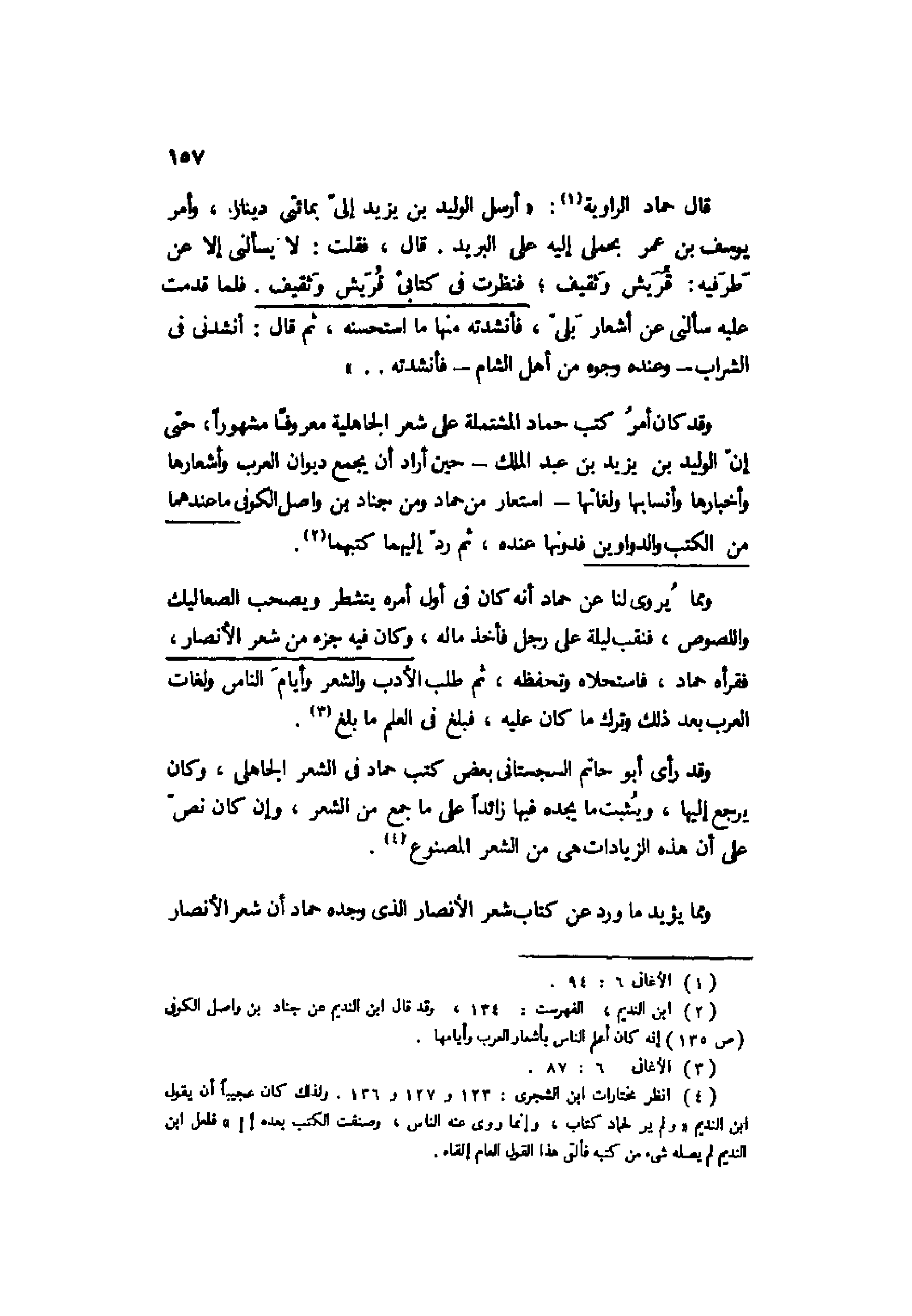 4 انظر مختارات ابن الشجري: 123 و127 و136. ولذلك كان عجيبًا أن يقول ابن النديم "ولم ير لحماد كتاب، وإنما روى عنه الناس، وصنفت الكتب بعده!! " فلعل ابن النديم لم يصله شيء من كتبه فألقى هذا القول العام إلقاء.
