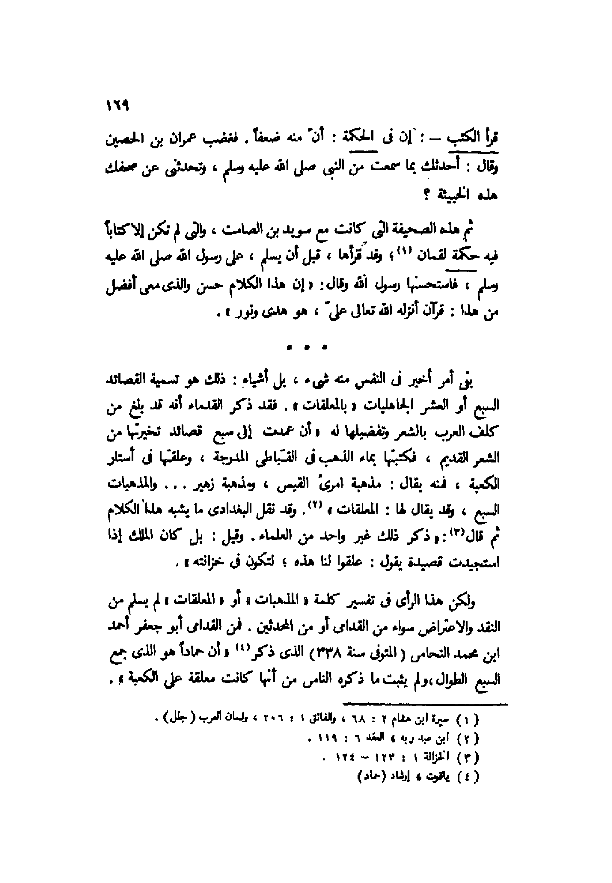 قرأ الكتب-: إن في الحكمة: أن منه ضعفًا. فغضب عمران بن الحصين وقال: أحدثك بما سمعت من النبي صلى الله عليه وسلم، وتحدثني عن صحفك هذه الخبيثة؟