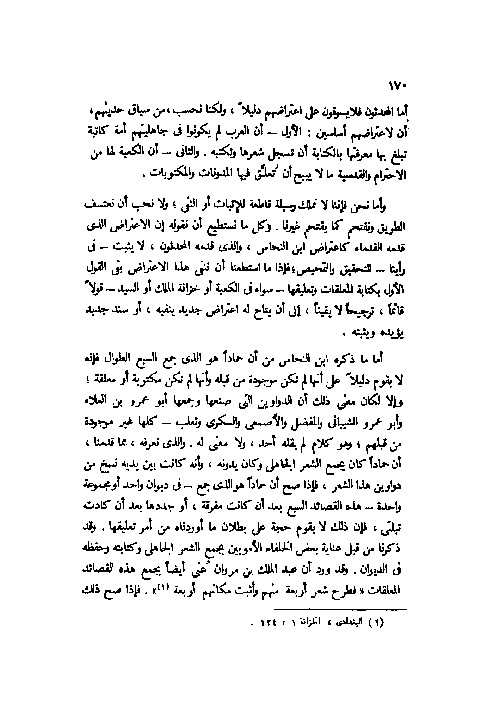أما ما ذكره ابن النحاس من أن حمادًا هو الذي جمع السبع الطوال فإنه لا يقوم دليلًا على أنها لم تكن موجودة من قبله وأنها لم تكن مكتوبة أو معلقة؛ وإلا لكان معنى ذلك أن الدواوين التي صنعها وجمعها أبو عمرو بن العلاء وأبو عمرو الشيباني والمفضل والأصمعي والسكري وثعلب كلها غير موجودة من قبلهم؛ وهو كلام لم يقله أحد، ولا معنى له. والذي نعرفه، مما قدمنا، أن حمادًا كان يجمع الشعر الجاهلي وكان يدونه، وأنه كانت بين يديه نسخ من دواوين هذا الشعر، فإذا صح أن حمادًا هو الذي جمع -في ديوان واحد أو مجموعة واحدة- هذه القصائد السبع بعد أن كانت مفرقة، أو جددها بعد أن كادت تبلى، فإن ذلك لا يقوم حجة على بطلان ما أوردناه من أمر تعليقها. وقد ذكرنا من قبل عناية بعض الخلفاء الأمويين بجمع الشعر الجاهلي وكتابته وحفظه في الديوان. وقد ورد أن عبد الملك بن مروان عُني أيضًا بجمع هذه القصائد المعلقات "فطرح شعر أربعة منهم وأثبت مكانهم أربعة1". فإذا صح ذلك