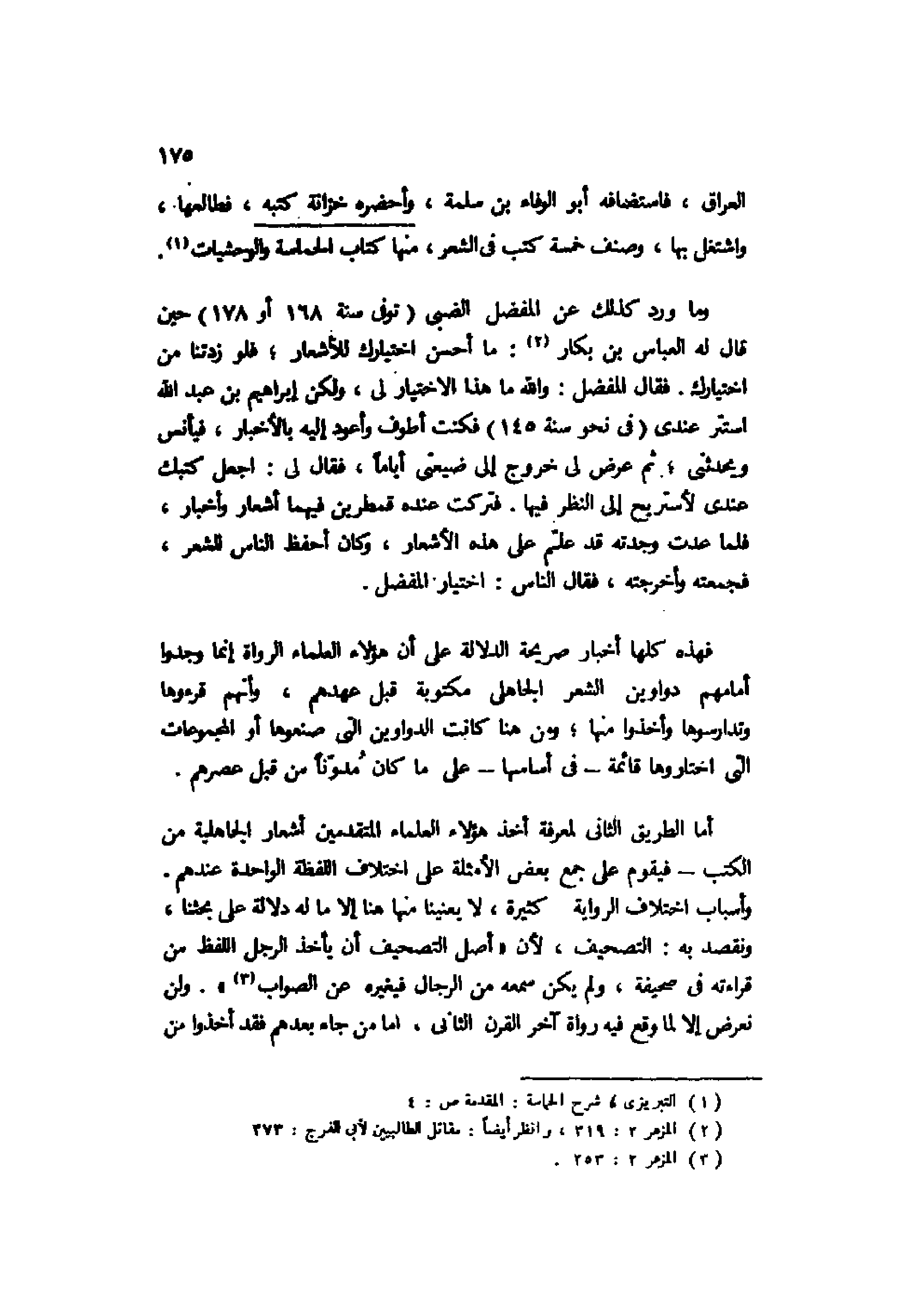 وما ورد كذلك عن المفضل الضبي "توفي سنة 168 أو 178" حين قال له العباس بن بكار2: ما أحسن اختيارك للأشعار؛ فلو زدتنا من اختيارك. فقال المفضل: والله ما هذا الاختيار لي، ولكن إبراهيم بن عبد الله استتر عندي "في نحو سنة 145" فكنت أطوف وأعود إليه بالأخبار، فيأنس ويحدثني؛ ثم عرض لي خروج إلى ضيعتي أيامًا، فقال لي: اجعل كتبك عندي لأستريح إلى النظر فيها. فتركت عنده قمطرين فيهما أشعار وأخبار، فلما عدت وجدته قد علم على هذه الأشعار، وكان أحفظ الناس للشعر، فجمعته وأخرجته، فقال الناس: اختيار المفضل.