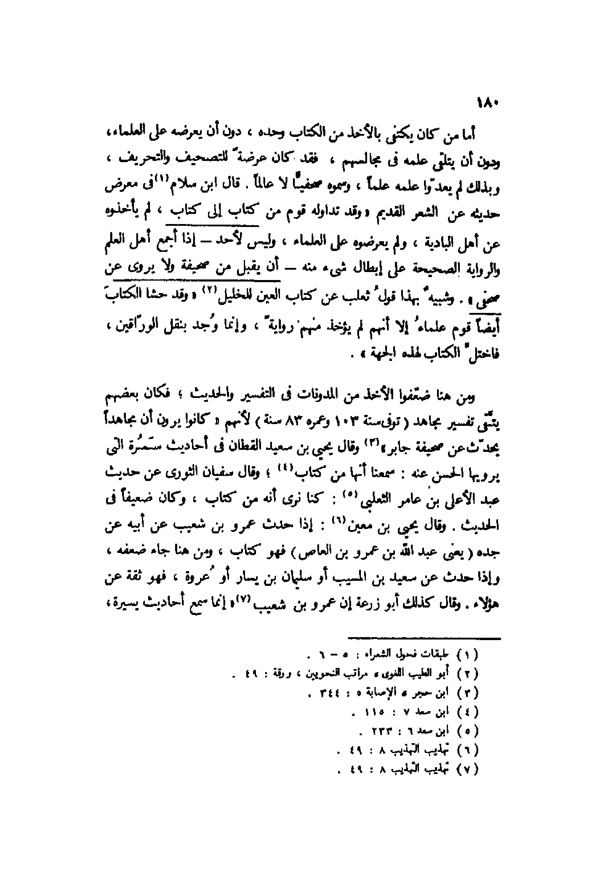 أما من كان يكتفي بالأخذ من الكتاب وحده، دون أن يعرضه على العلماء، ودون أن يتلقى علمه في مجالسهم، فقد كان عرضة للتصحيف والتحريف، وبذلك لم يعدوا علمه علمًا، وسموه صحفيًّا لا عالمًا. قال ابن سلام1 في معرض حديثه عن الشعر القديم "وقد تداوله قوم من كتاب إلى كتاب، لم يأخذوه عن أهل البادية، ولم يعرضوه على العلماء، وليس لأحد -إذا أجمع أهل العلم والرواية الصحيحة على إبطال شيء منه- أن يقبل من صحيفة ولا يروي عن صحفي". وشبيه بهذا قول ثعلب عن كتاب العين للخليل2 "وقد حشا الكتاب أيضًا قوم علماء لا أنهم لم يؤخذ منهم رواية، وإنما وجد بنقل الوراقين، فاختل الكتاب لهذه الجهة".