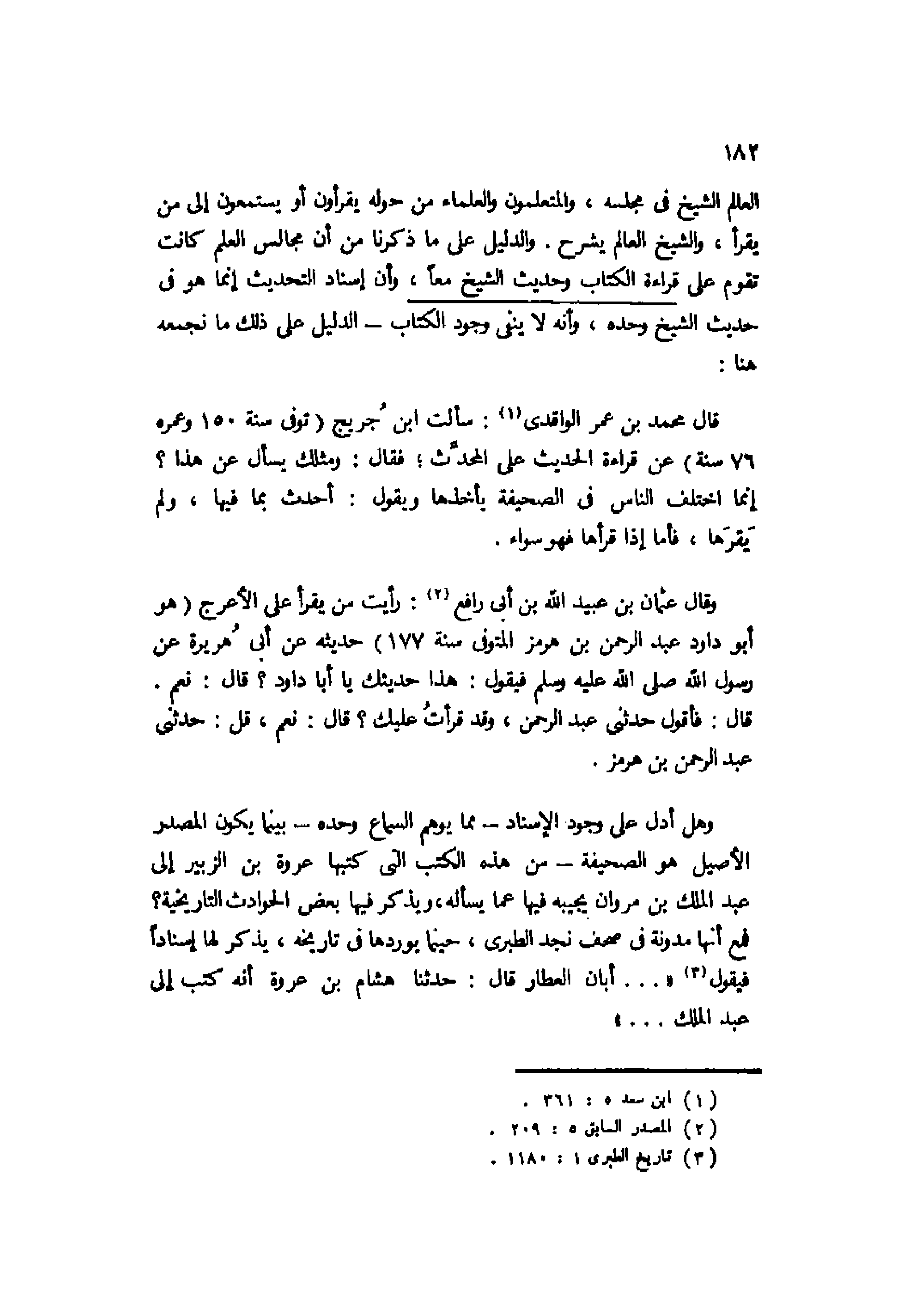 قال محمد بن عمر الواقدي1: سألت ابن جريج "توفي سنة 150 وعمره 76سنة" عن قراءة الحديث على المحدث؛ فقال: ومثلك يسأل عن هذا؟ إنما اختلف الناس في الصحيفة يأخذها ويقول: أحدث بما فيها، ولم يقرها، فأما إذا قرأها فهو سواء.