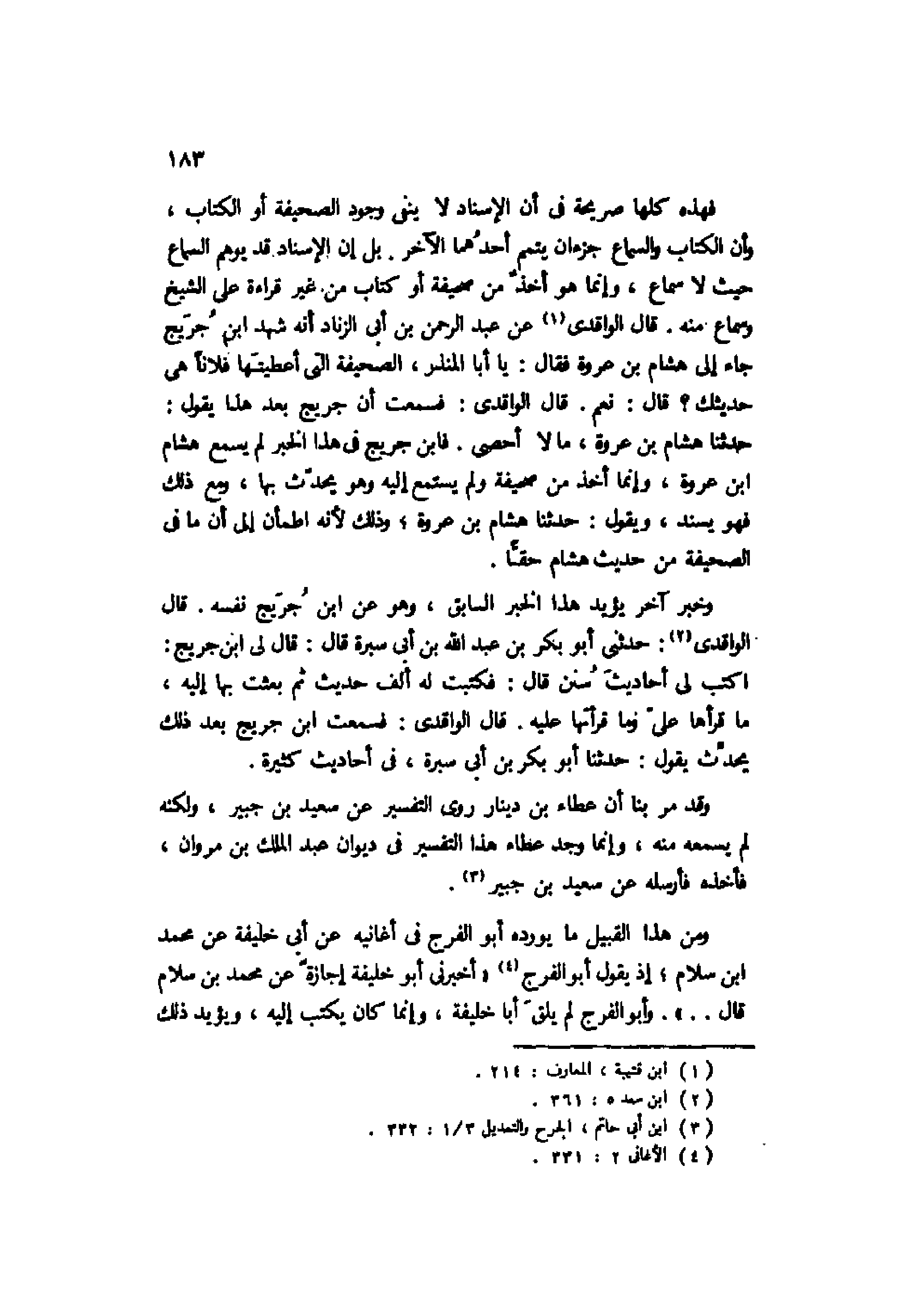 فهذه كلها صريحة في أن الإسناد لا ينفي وجود الصحيفة أو الكتاب، وأن الكتاب والسماع جزءان يتمم أحدهما الآخر. بل إن الإسناد قد يوهم السماع حيث لا سماع، وإنما هو أخذ من صحيفة أو كتاب من غير قراءة على الشيخ وسماع منه. قال الواقدي1 عن عبد الرحمن بن أبي الزناد أنه شهد ابن جريج جاء إلى هشام بن عروة فقال: يا أبا المنذر، الصحيفة التي أعطيتها فلانًا هي حديثك؟ قال: نعم. قال الواقدي: فسمعت أن جريج بعد هذا يقول: حدثنا هشام بن عروة، ما لا أحصي. فابن جريج في هذا الخبر لم يسمع هشام بن عروة، وإنما أخذ من صحيفة ولم يستمع إليه وهو يحدث بها، ومع ذلك فهو يسند، ويقول: حدثنا هشام بن عروة؛ وذلك لأنه اطمأن إلى أن ما في الصحيفة من حديث هشام حقًّا.