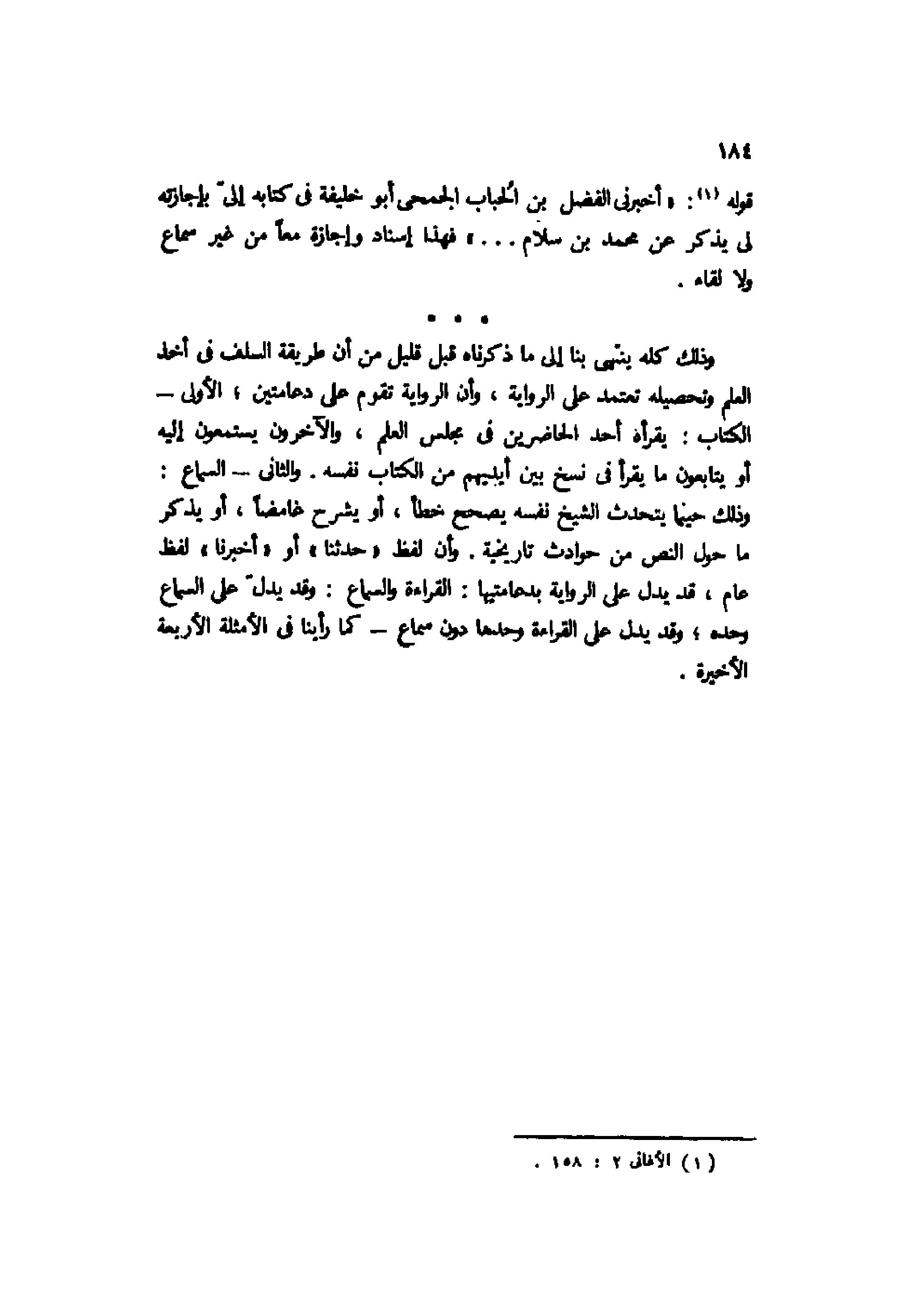 وذلك كله ينتهي بنا إلى ما ذكرناه قبل قليل من أن طريقة السلف في أخذ العلم وتحصيله تعتمد على الرواية، وأن الرواية تقوم على دعامتين؛ الأولى: الكتاب: يقرأه أحد الحاضرين في مجلس العلم، والآخرون يستمعون إليه أو يتابعون ما يقرأ في نسخ بين أيديهم من الكتاب نفسه. والثاني: السماع: وذلك حينما يتحدث الشيخ نفسه يصحح خطأ، أو يشرح غامضًا، أو يذكر ما حول النص من حوادث تاريخية. وأن لفظ "حدثنا" أو "أخبرنا" لفظ عام، قد يدل على الرواية بدعامتيها: القراءة والسماع: وقد يدل على السماع وحده؛ وقد يدل على القراءة وحدها دون سماع كما رأينا في الأمثلة الأربعة الأخيرة.