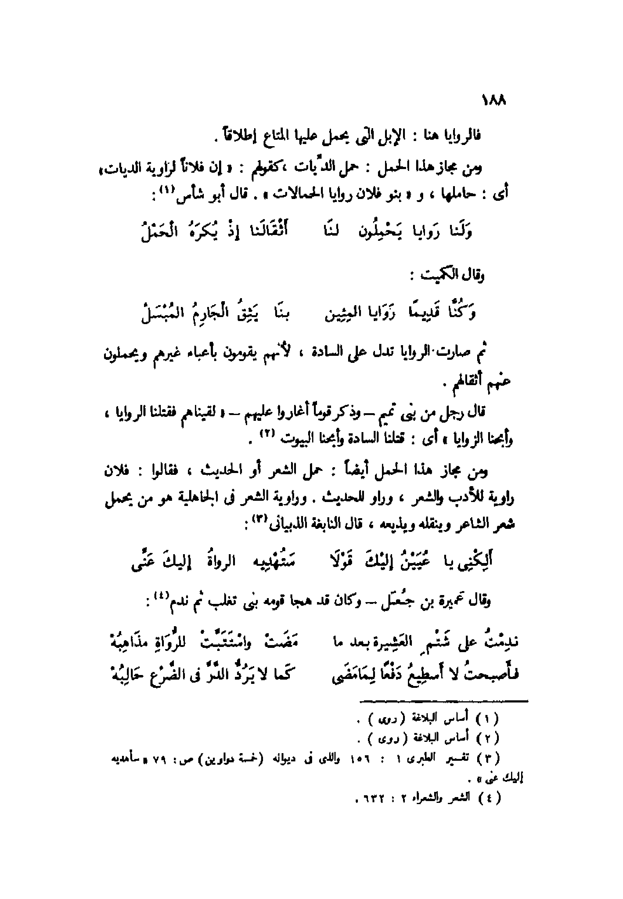 ومن مجاز هذا الحمل أيضًا: حمل الشعر أو الحديث، فقالوا: فلان راوية للأدب والشعر، وراوٍ للحديث. وراوية الشعر في الجاهلية هو من يحمل شعر الشاعر وينقله ويذيعه، قال النابغة الذبياني3: