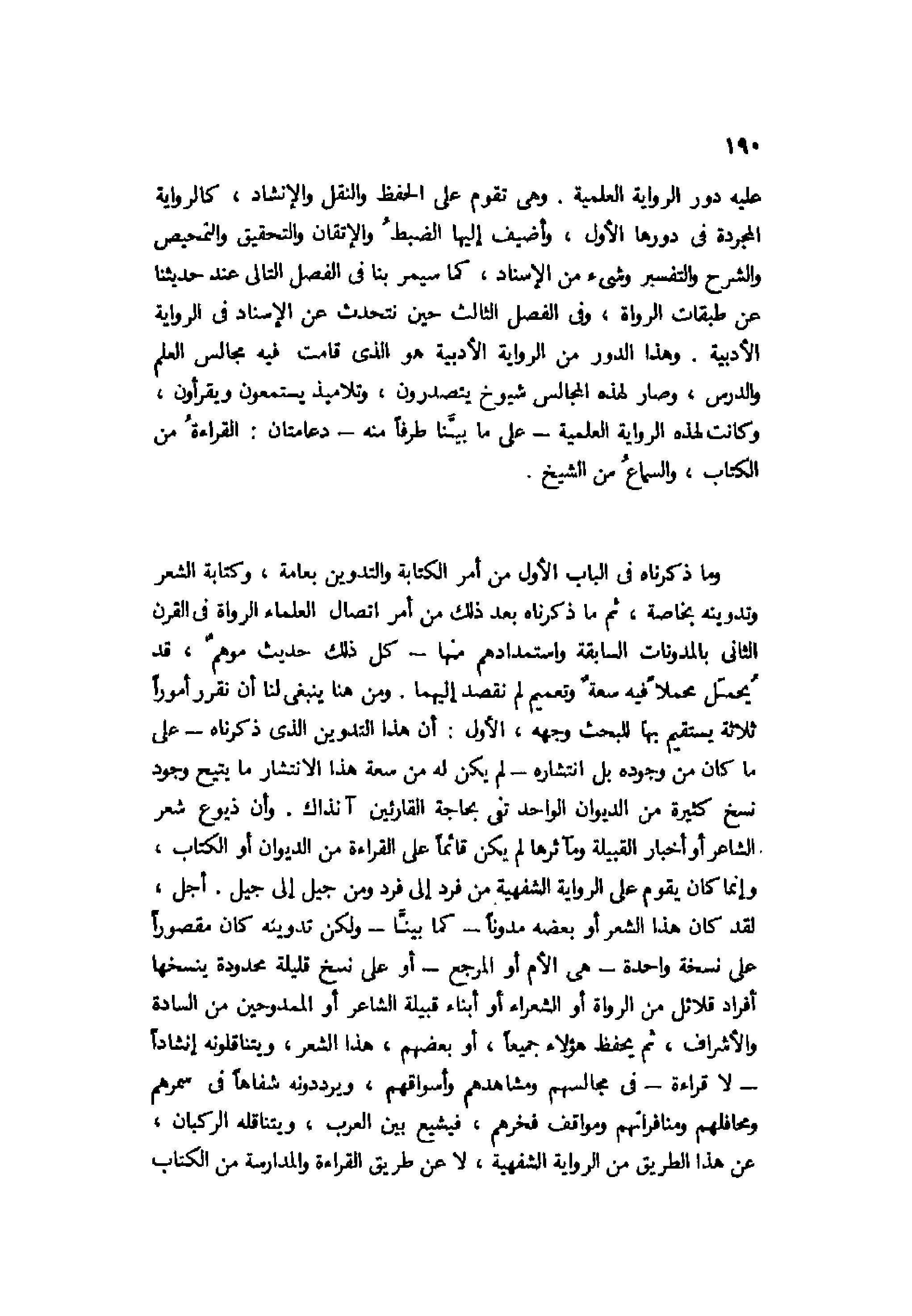 وما ذكرناه في الباب الأول من أمر الكتابة والتدوين بعامة، وكتابة الشعر وتدوينه بخاصة، ثم ما ذكرناه بعد ذلك من أمر اتصال العلماء الرواة في القرن الثاني بالمدونات السابقة واستمدادهم منها، كل ذلك حديث موهم، قد يحمل محملًا فيه سعة وتعميم لم نقصد إليهما. ومن هنا ينبغي لنا أن نقرر أمورًا ثلاثة يستقيم بها للبحث وجهه، الأول: أن هذا التدوين الذي ذكرناه -على ما كان من وجوده بل انتشاره- لم يكن له من سعة هذا الانتشار ما يتيح وجود نسخ كثيرة من الديوان الواحد تفي بحاجة القارئين آنذاك. وأن ذيوع شعر الشاعر أو أخبار القبيلة ومآثرها لم يكن قائمًا على القراءة من الديوان أو الكتاب، وإنما كان يقوم على الرواية الشفهية من فرد إلى فرد ومن جيل إلى جيل. أجل، لقد كان هذا الشعر أو بعضه مدونًا -كما بينَّا- ولكن تدوينه كما مقصورًا على نسخة واحدة -هي الأم أو المرجع- أو على نسخ قليلة محدودة ينسخها أفراد قلائل من الرواة أو الشعراء أو أبناء قبيلة الشاعر أو الممدوحين من السادة والأشراف، ثم يحفظ هؤلاء جميعًا، أو بعضهم، هذا الشعر، ويتناقلونه إنشادًا -لا قراءة- في مجالسهم ومشاهدهم وأسواقهم، ويرددونه شفاهًا في سمرهم ومحافلهم ومنافراتهم ومواقف فخرهم فيشيع بين العرب، ويتناقله الركبان، عن هذا الطريق من الرواية الشفهية، لا عن طريق القراءة والمدرسة من الكتاب
