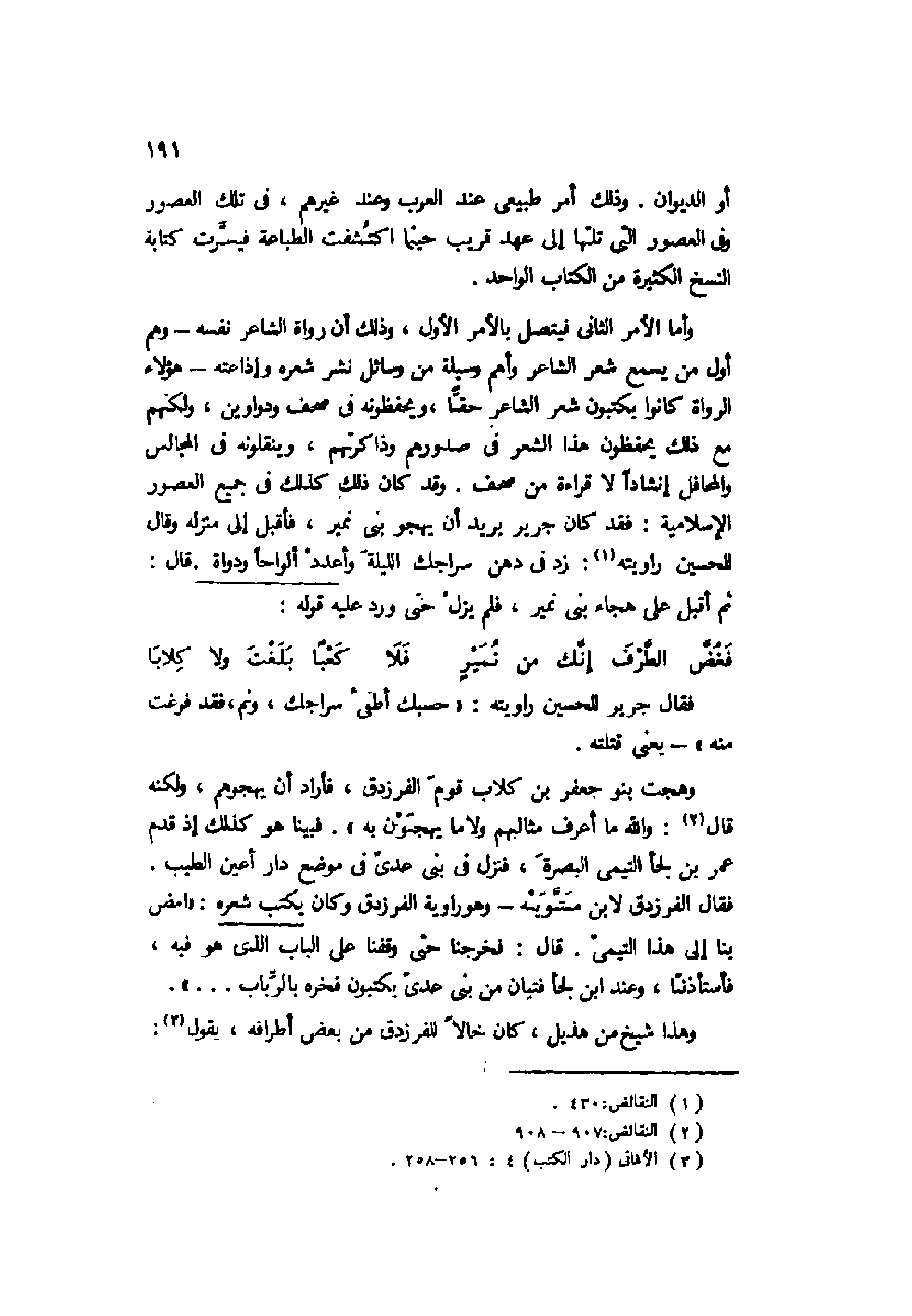 وأما الأمر الثاني فيتصل بالأمر الأول، وذلك أن رواة الشاعر نفسه -وهم أول من يسمع شعر الشاعر وأهم وسيلة من وسائل نشر شعره وإذاعته- هؤلاء الرواة كانوا يكتبون شعر الشاعر حقًّا، ويحفظونه في صحف ودواوين، ولكنهم مع ذلك يحفظون هذا الشعر في صدورهم وذاكرتهم، وينقلونه في المجالس والمحافل إنشادًا لا قراءة من صحف. وقد كان ذلك كذلك في جميع العصور الإسلامية: فقد كان جرير يريد أن يهجو بني نمير، فأقبل إلى منزله وقال للحسين راويته1: زد في دهن سراجك الليلة وأعدد ألواحًا ودواة. قال: ثم أقبل على هجاء بني نمير، فلم يزل حتى ورد عليه قوله: