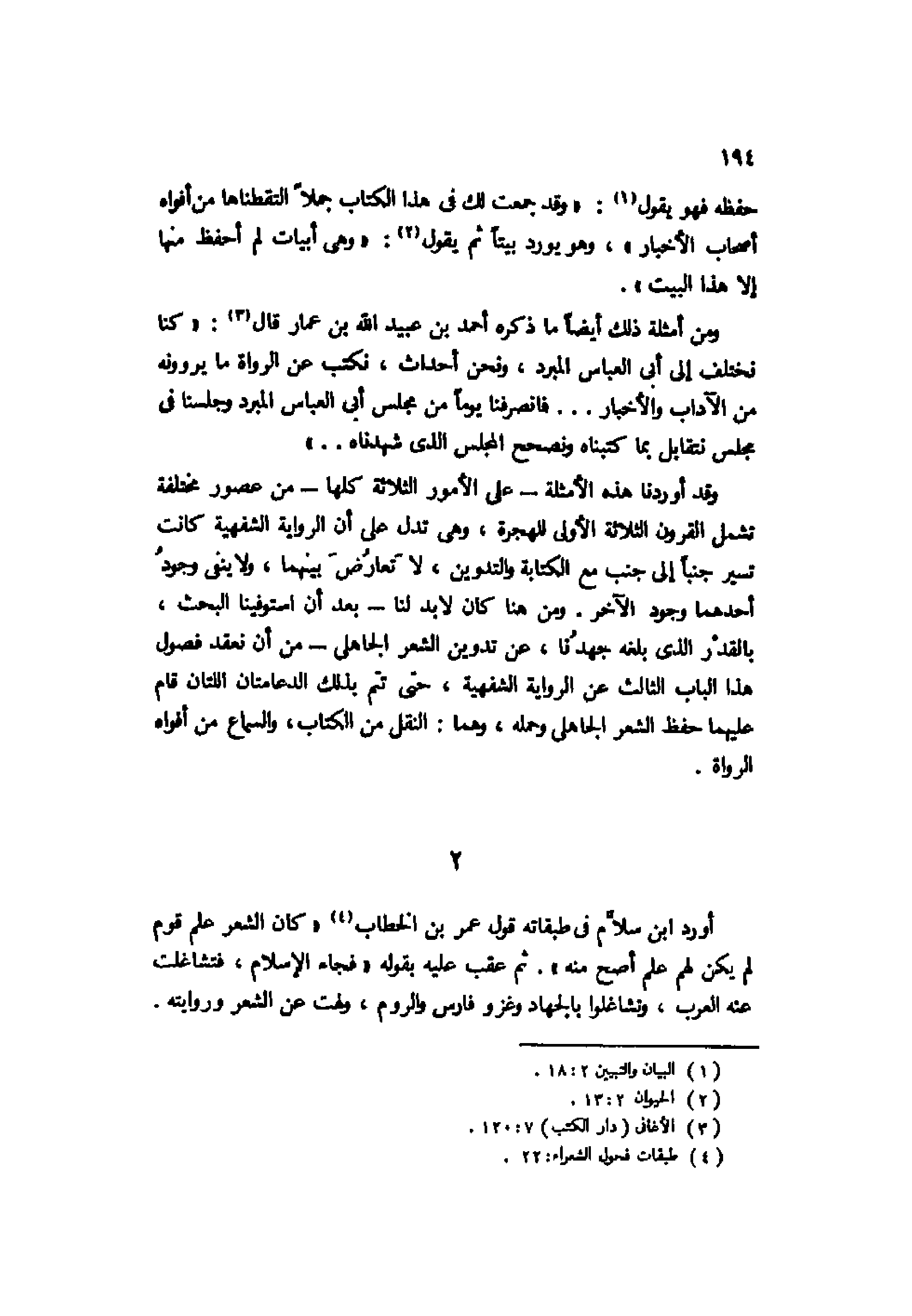 وقد أوردنا هذه الأمثلة -على الأمور الثلاثة كلها- من عصور مختلفة تشمل القرون الثلاثة الأولى للهجرة، وهي تدل على أن الرواية الشفهية كانت تسير جنبًا إلى جنب مع الكتابة والتدوين، لا تعارض بينهما، ولا ينفي وجود أحدهما وجود الآخر. ومن هنا كان لا بد لنا -بعد أن استوفينا البحث، بالقدر الذي بلغه جهدنا، عن تدوين الشعر الجاهلي- من أن نعقد فصول هذا الباب الثالث عن الرواية الشفهية، حتى تتم بذلك الدعامتان اللتان قام عليهما حفظ الشعر الجاهلي وحمله، وهما: انقل من الكتاب، والسماع من أفواه الرواة.