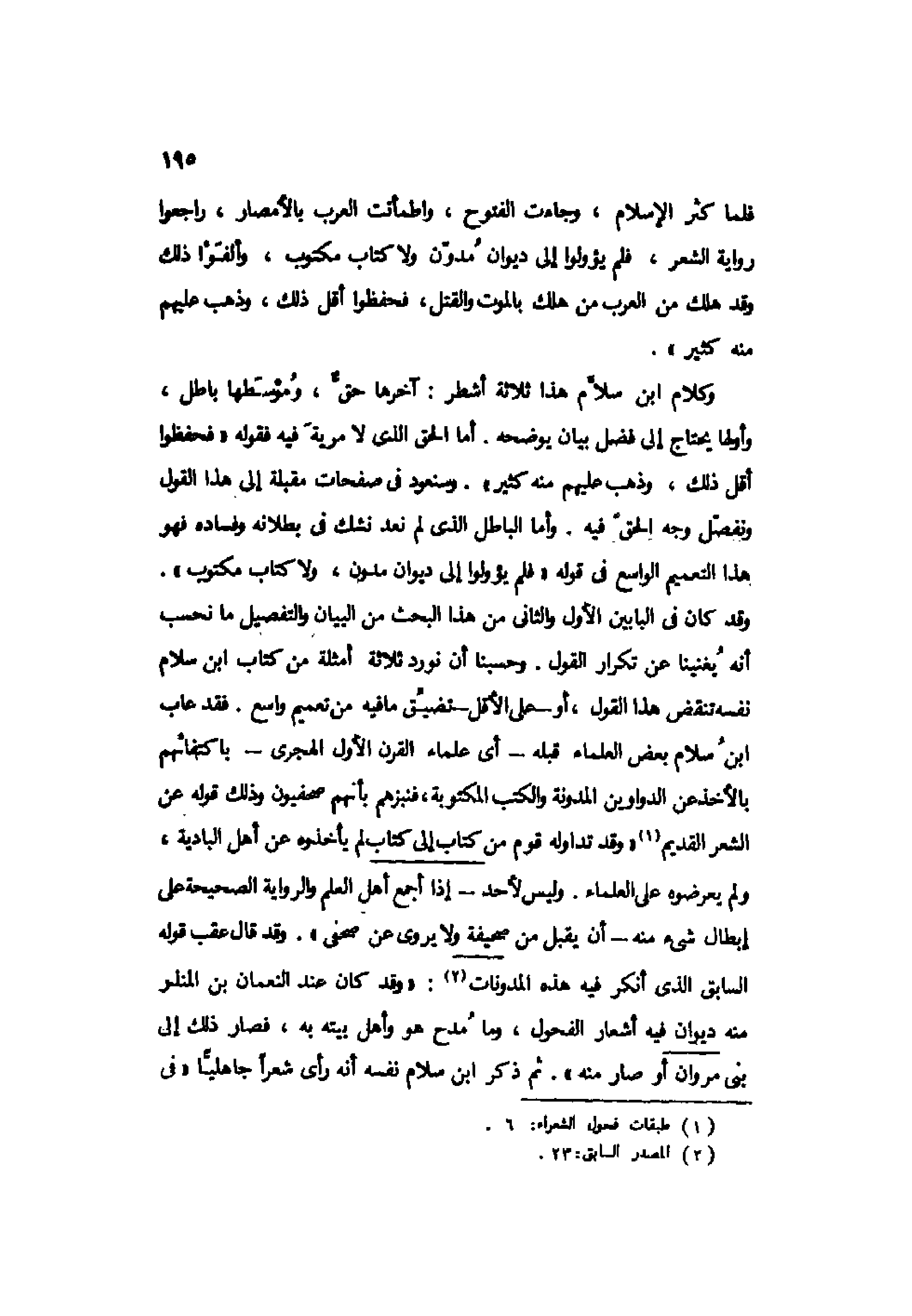 وكلام ابن سلام هذا ثلاثة أشطر: آخرها حق، وموسطها باطل، وأولها يحتاج إلى فضل بيان يوضحه. أما الحق الذي لا مرية فيه فقوله "فحفظوا أقل ذلك، وذهب عليهم منه كثير". وسنعود في صفحات مقبلة إلى هذا القول ونفصل وجه الحق فيه. وأما الباطل الذي لم نعد نشك في بطلانه وفساده فهو هذا التعميم الواسع في قوله "فلم يؤولوا إلى ديوان مدون، ولا كتاب مكتوب".