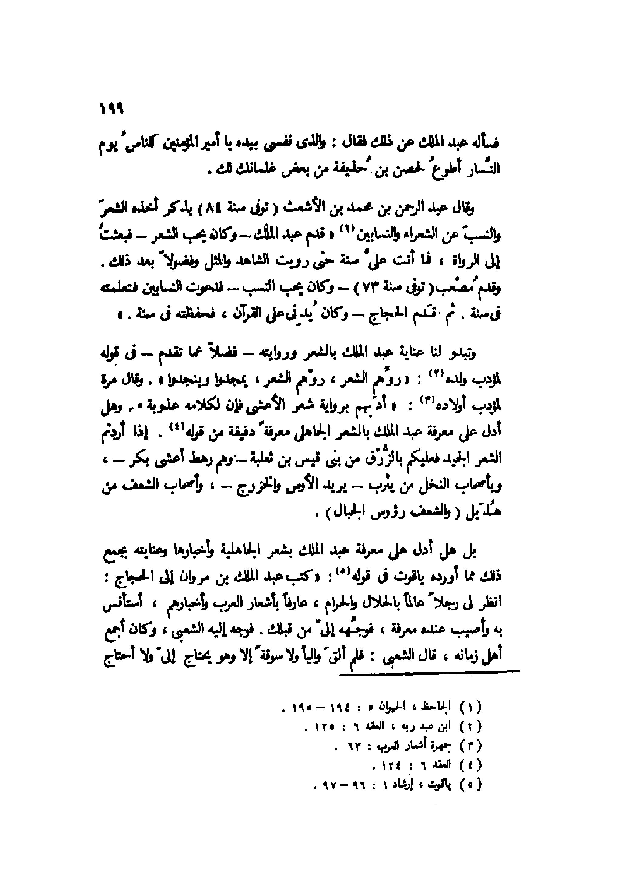 بل هل أدل على معرفة عبد الملك بشعر الجاهلية وأخبارها وعنايتة بجمع ذلك مما أورده ياقوت في قوله5: "كتب عبد الملك بن مروان إلى الحجاج: انظر لي رجلًا عالمًا بالحلال، عارفًا بأشعار العرب وأخبارهم، أستانس به وأصيب عنده معرفة، فوجهه إلى من قبلك. فوجه إليه الشعبي، وكان أجمع أهل زمانه، قال الشعبي: فلم ألق واليًا ولا سوقةً إلا وهو يحتاج إلي ولا أحتاج