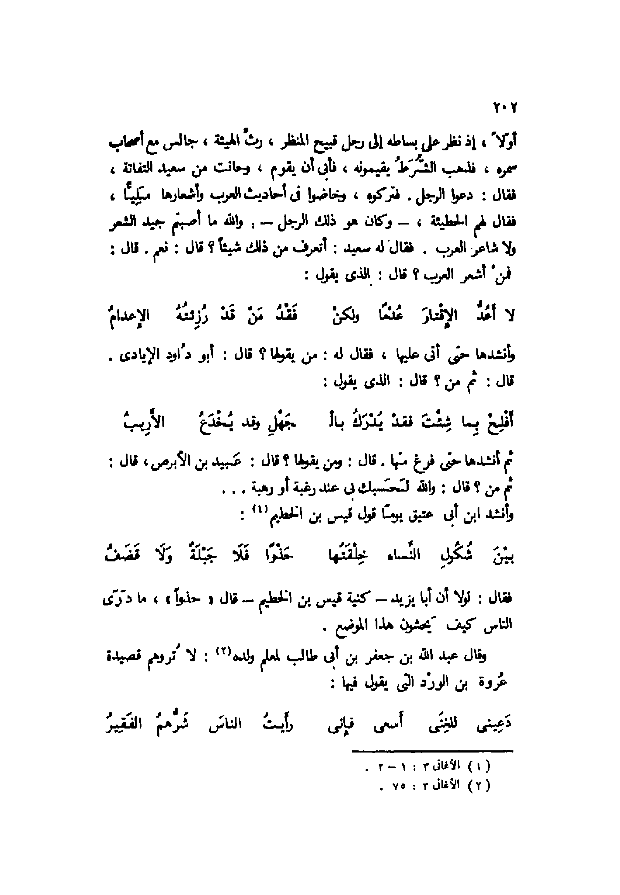 َُُأَِْوْلًِا، إذ نظر على بساطه إلى رجل قبيح المنظر، رث الهيئة، جالس مع أصحاب سمره، فذهب الشرط يقيمونه، فأبى أن يقوم، وحانت من سعيد التفاتة، فقال: دعوا الرجل. فتركوه، وخاضوا في أحاديث العرب وأشعارها مليًّا، فقال لهم الحطيئة، -وكان هو ذلك الرجل-: والله ما أصبتم جيد الشعر ولا شاعر العرب. فقال له سعيد: أتعرف من ذلك شيئًا؟ قال: نعم. قال: فمن أشعر العرب؟ قال: الذي يقول: