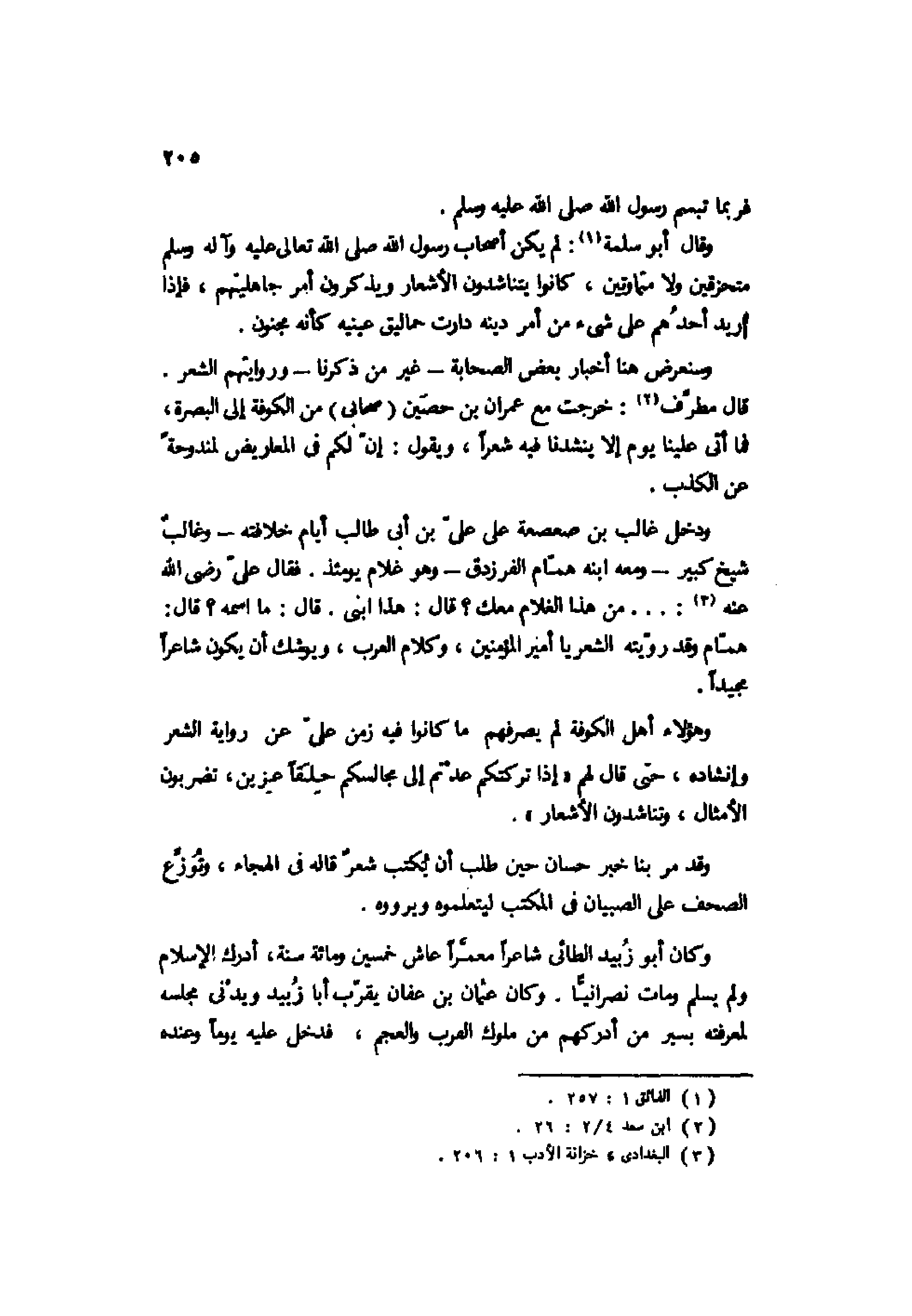 وسنعرض هنا أخبار بعض الصحابة -غير من ذكرنا- وروايتهم الشعر. قال مطرف2: خرجت مع عمران بن حصين "صحابي" من الكوفة إلى البصرة، فما أتى علينا يوم إلا ينشدنا فيه شعرًا، ويقول: إن لكم في المعاريض لمندوحةً عن الكذب.