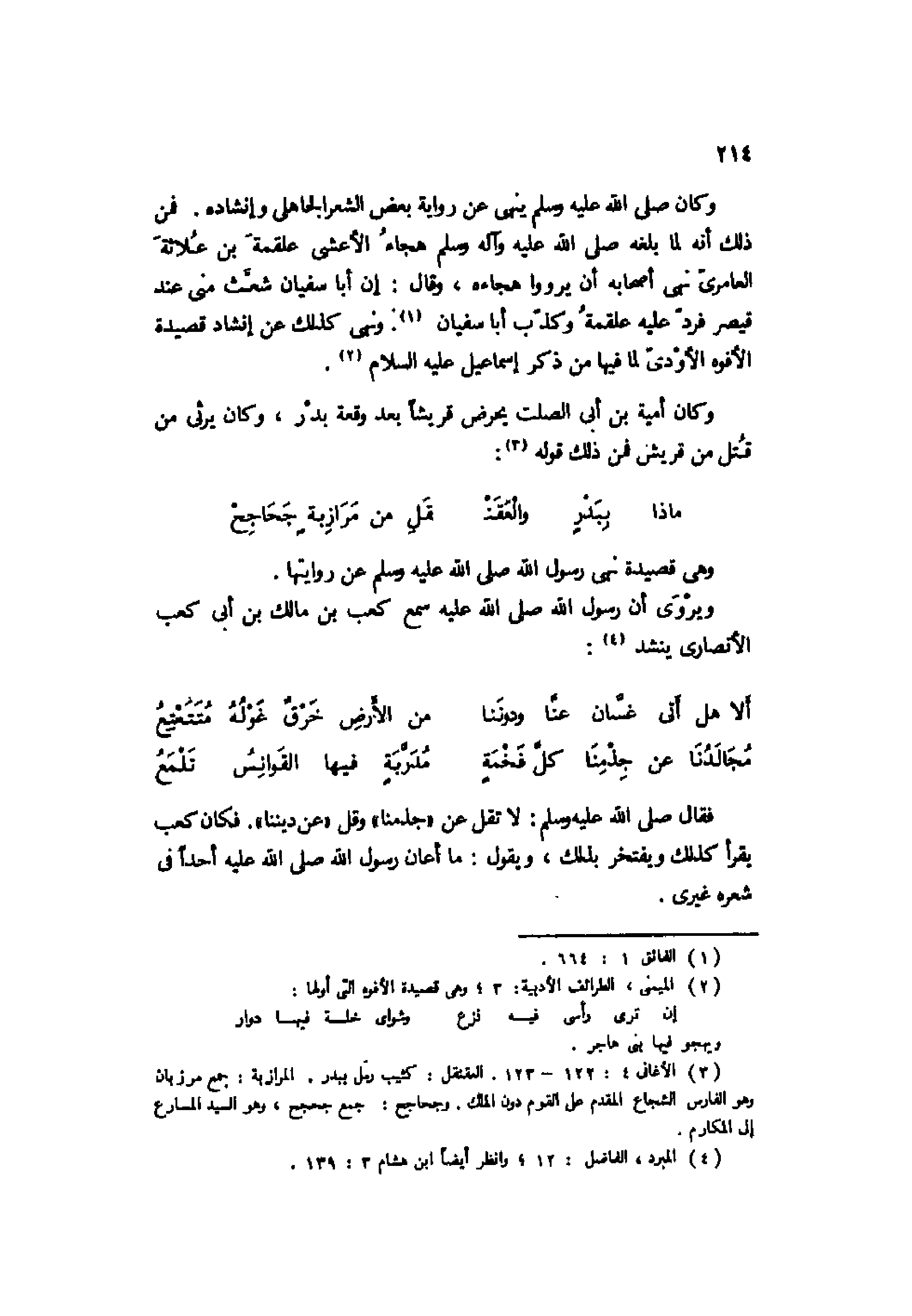 ويروى أن رسول الله صلى الله عليه سمع كعب بن مالك بن أبي كعب الأنصاري ينشد4: