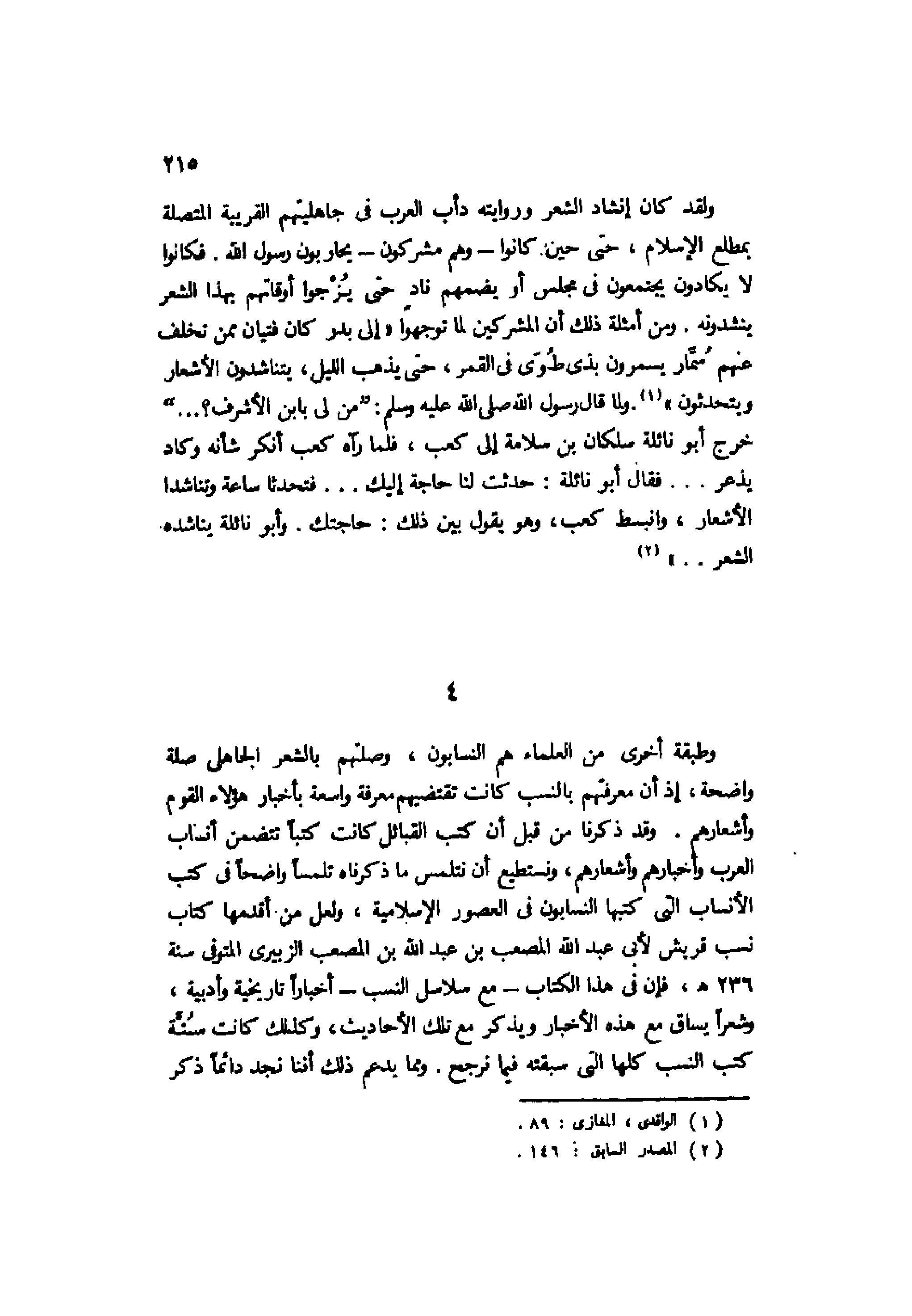 وطبقة أخرى من العلماء هم النسابون، وصلتهم بالشعر الجاهلي صلة واضحة، إذ أن معرفتهم بالنسب كانت تقتضيهم معرفة واسعة بأخبار هؤلاء القوم وأشعارهم. وقد ذكرنا من قبل أن كتب القبائل كانت كتبًا تتضمن أنساب العرب وأخبارهم وأشعارهم، ونستطيع أن نتلمس ما ذكرناه تلمسًا واضحًا في كتب الأنساب التي كتبها النسابون في العصور الإسلامية، ولعل من أقدمها كتاب نسب قريش لأبي عبد الله المصعب بن عبد الله بن المصعب الزبيري المتوفى سنة 236هـ، فإن في هذا الكتاب -مع سلاسل النسب- أخبارًا تاريخية وأدبية، وشعرًا يساق مع هذه الأخبار ويذكر مع تلك الأحاديث، وكذلك كانت سنة كتب النسب كلها التي سبقته فيما نرجح. ومما يدعم ذلك أننا نجد دائمًا ذكر