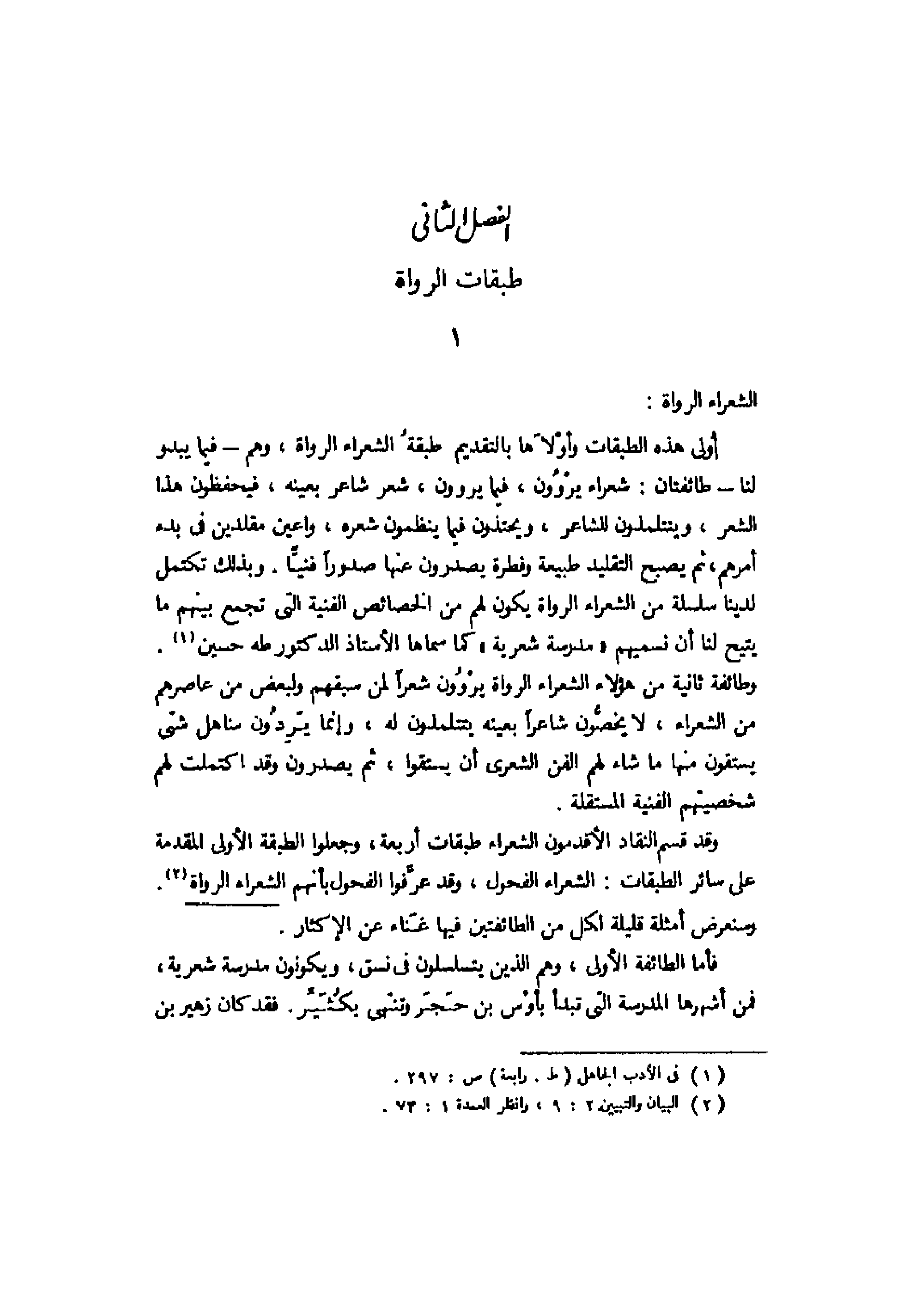 أولى هذه الطبقات وأولاها بالتقديم طبقة الشعراء الرواة، وهم -فيما يبدو لنا- طائفتان: شعراء يروون، فيما يروون، شعر شاعر بعينه، فيحفظون هذا الشعر، ويتتلمذون للشعر، ويحتذون فيما ينظمون شعره، واعين مقلدين في بدء أمرهم، ثم يصبح التقليد طبيعة وفطرة يصدرون عنها صدورًا فنيًّا. وبذلك تكتمل لدينا سلسلة من الشعراء الرواة يكون لهم من الخصائص الفنية التي تجمع بينهم ما يتيح لنا أن نسميهم "مدرسة شعرية" كما سماها الأستاذ الدكتور طه حسين1.
