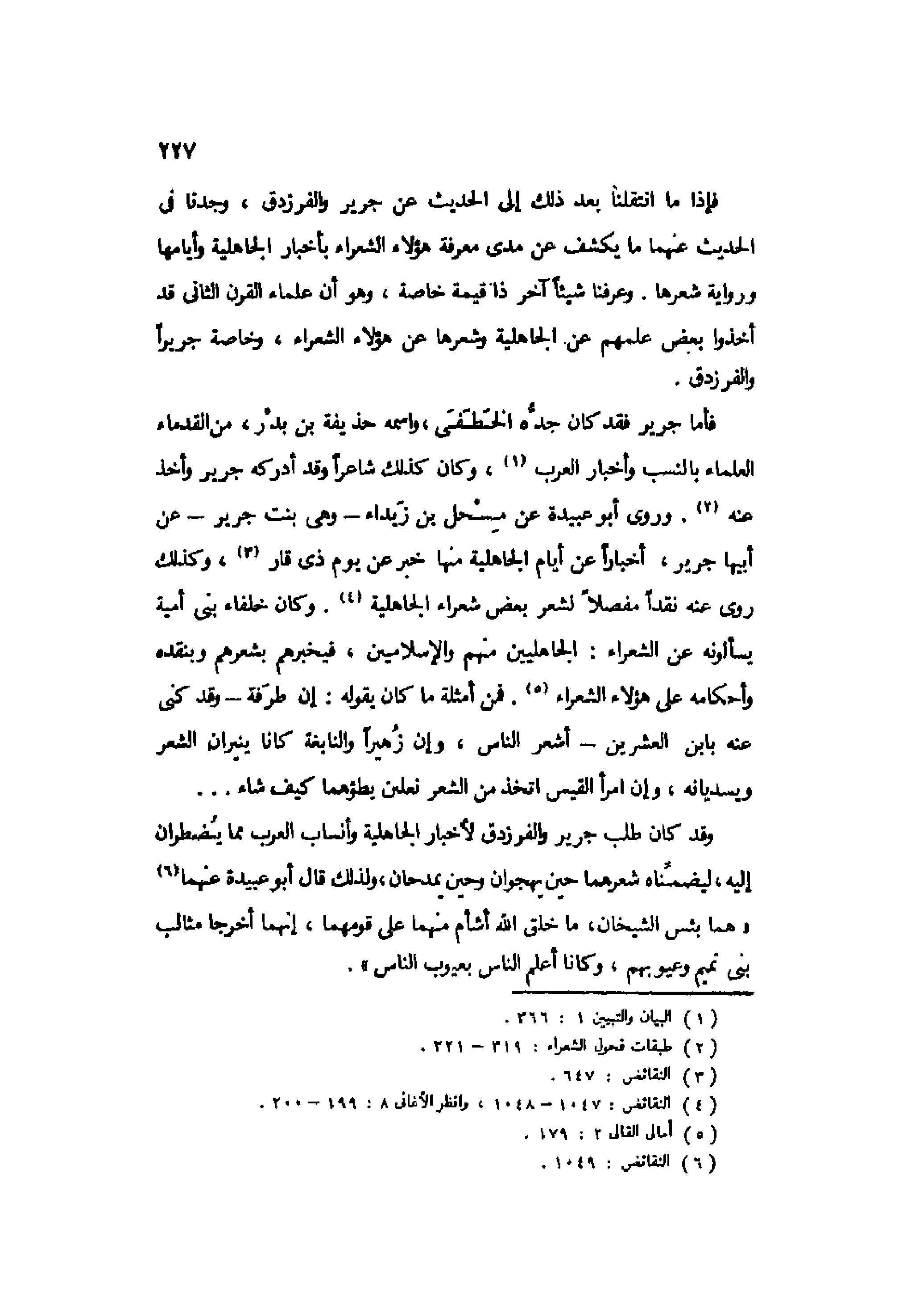 فإذا ما انتقلنا بعد ذلك إلى الحديث عن جرير والفرزدق، وجدنا في الحديث عنهما ما يكشف عن مدى معرفة هؤلاء الشعراء بأخبار الجاهلية وأيامها ورواية شعرها. وعرفنا شيئًا آخر ذا قيمة خاصة، وهو أن علماء القرن الثاني قد أخذوا بعض علمهم عن الجاهلية وشعرها عن هؤلاء الشعراء، وخاصة جريرًا والفرزدق.