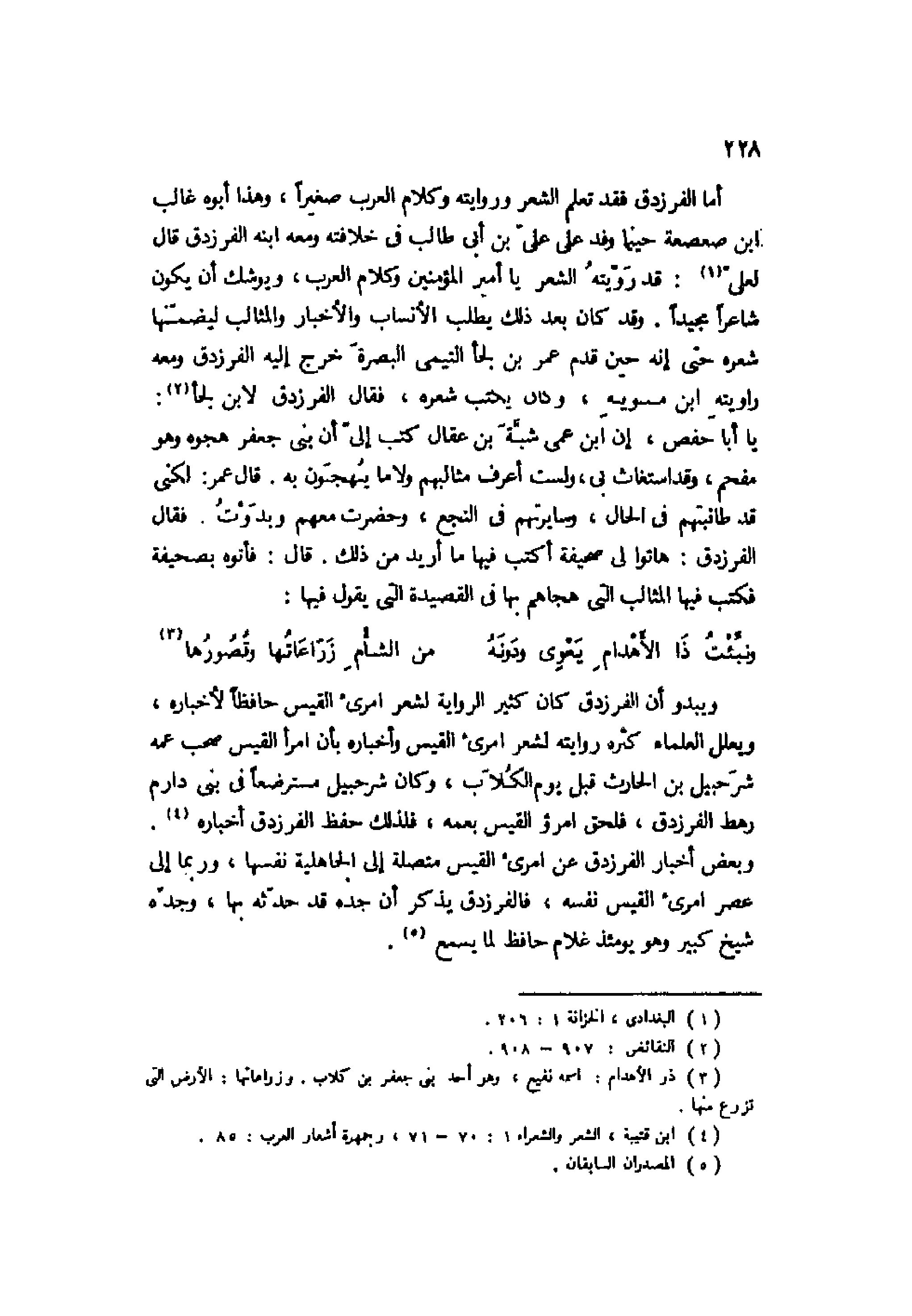 وبعض أخبار الفرزدق عن امرئ القيس متصلة إلى الجاهلية نفسها، وربما إلى عصر امرئ القيس نفسه، فالفرزدق يذكر أن جده قد حدثه بها، وجده شيخ كبير وهو يومئذ غلام حافظ لما يسمع5.