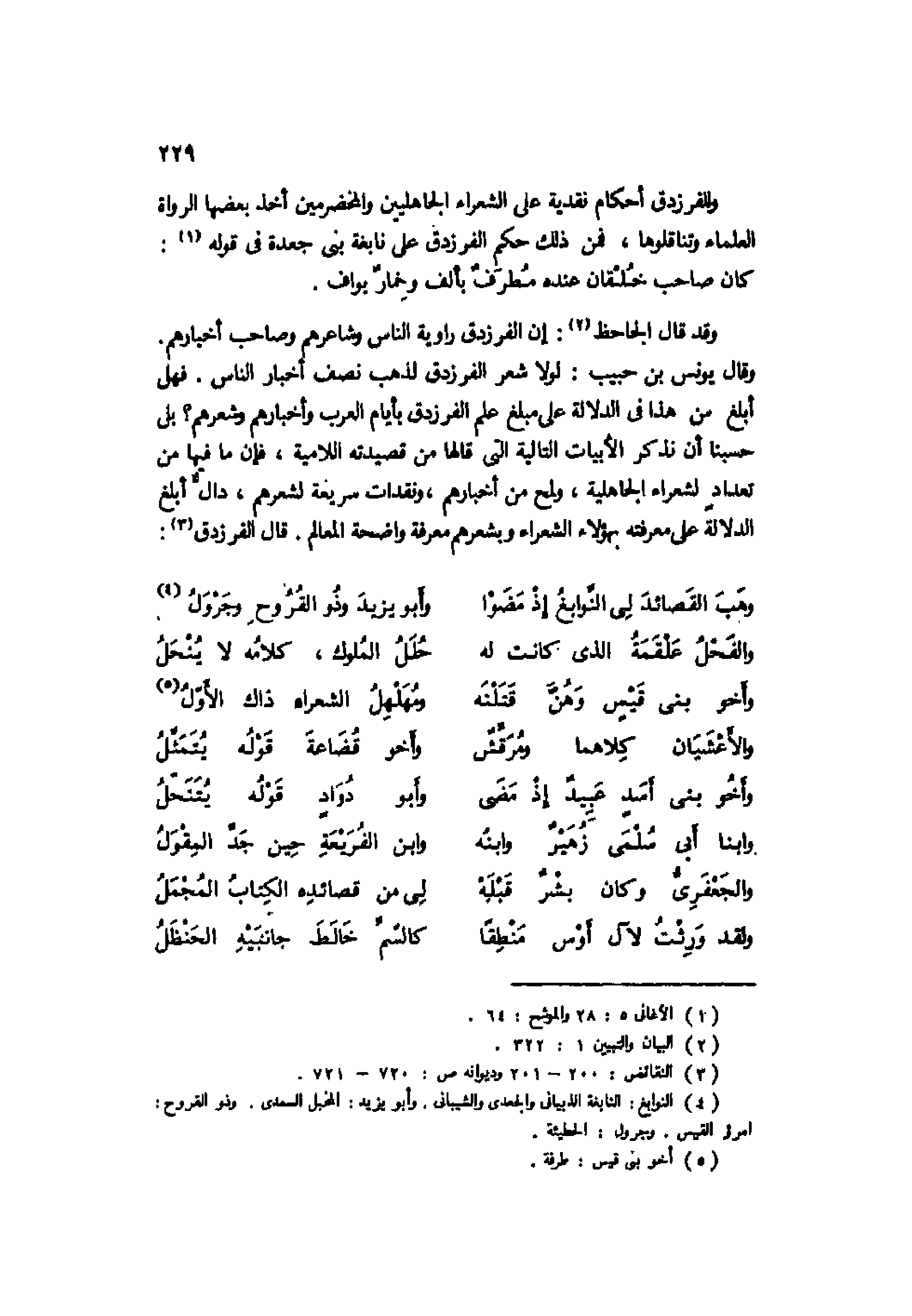 وقد قال الجاحظ2: إن الفرزدق راوية الناس وشاعرهم وصاحب أخبارهم. وقال يونس بن حبيب: لولا شعر الفرزدق لذهب نصف أخبار الناس. فهل أبلغ من هذا في الدلالة على مبلغ علم الفرزدق بأيام العرب وأخبارهم وشعرهم؟ بل حسبنا أن نذكر الأبيات التالية التي قالها من قصيدته اللامية، فإن ما فيها من تعداد لشعراء الجاهلية، ولمح من أخبارهم، ونقدات سريعة لشعرهم، دال أبلغ الدلالة على معرفته بهؤلاء الشعراء وبشعرهم معرفة واضحة المعالم. قال الفرزدق3: