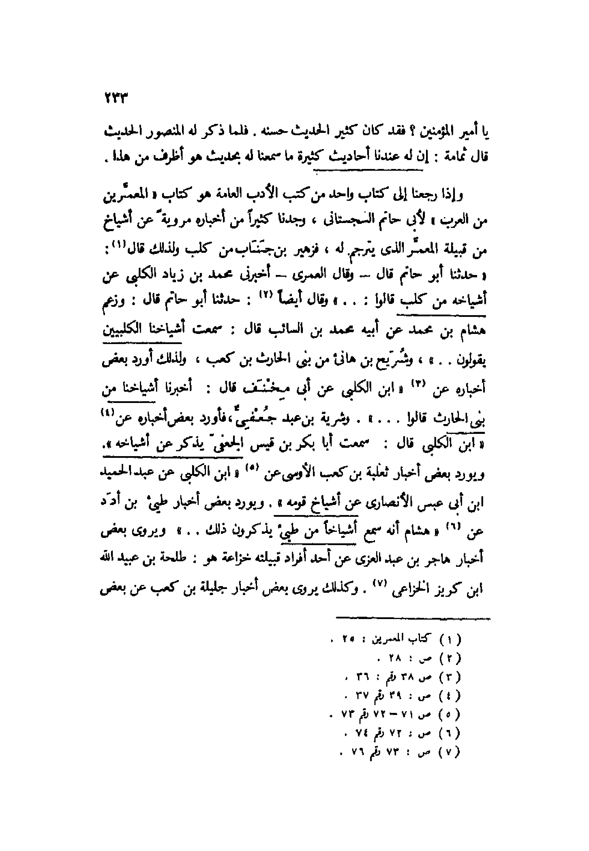 وإذا رجعنا إلى كتاب واحد من كتب الأدب العامة هو كتاب "المعمرين من العرب" لأبي حاتم السجستاني، وجدنا كثيرًا من أخباره مرويةً عن أشياخ من قبيلة المعمر الذي يترجم له، فزهير بن جناب من كلب ولذلك قال1: "حدثنا أبو حاتم قال -وقال العمري- أخبرني محمد بن زياد الكلبي عن أشياخه من كلب قالوا: ... " وقال أيضًا2: "حدثنا أبو حاتم قال: وزعم هشام بن محمد عن أبيه محمد بن السائب قال: سمعت أشياخنا الكلبيين يقولون.."، وشريح بن هانئ من بني الحارث بن كعب، ولذلك أورد بعض أخباره عن3 "ابن الكلبي عن أبي مخنف قال: أخبرنا أشياخنا من بني الحارث قالوا ... " وشرية بن عبد جعفي، فأورد بعض أخباره عن4 "ابن الكلبي قال: سمعت أبا بكر بن قيس الجعفي يذكر عن أشياخه".