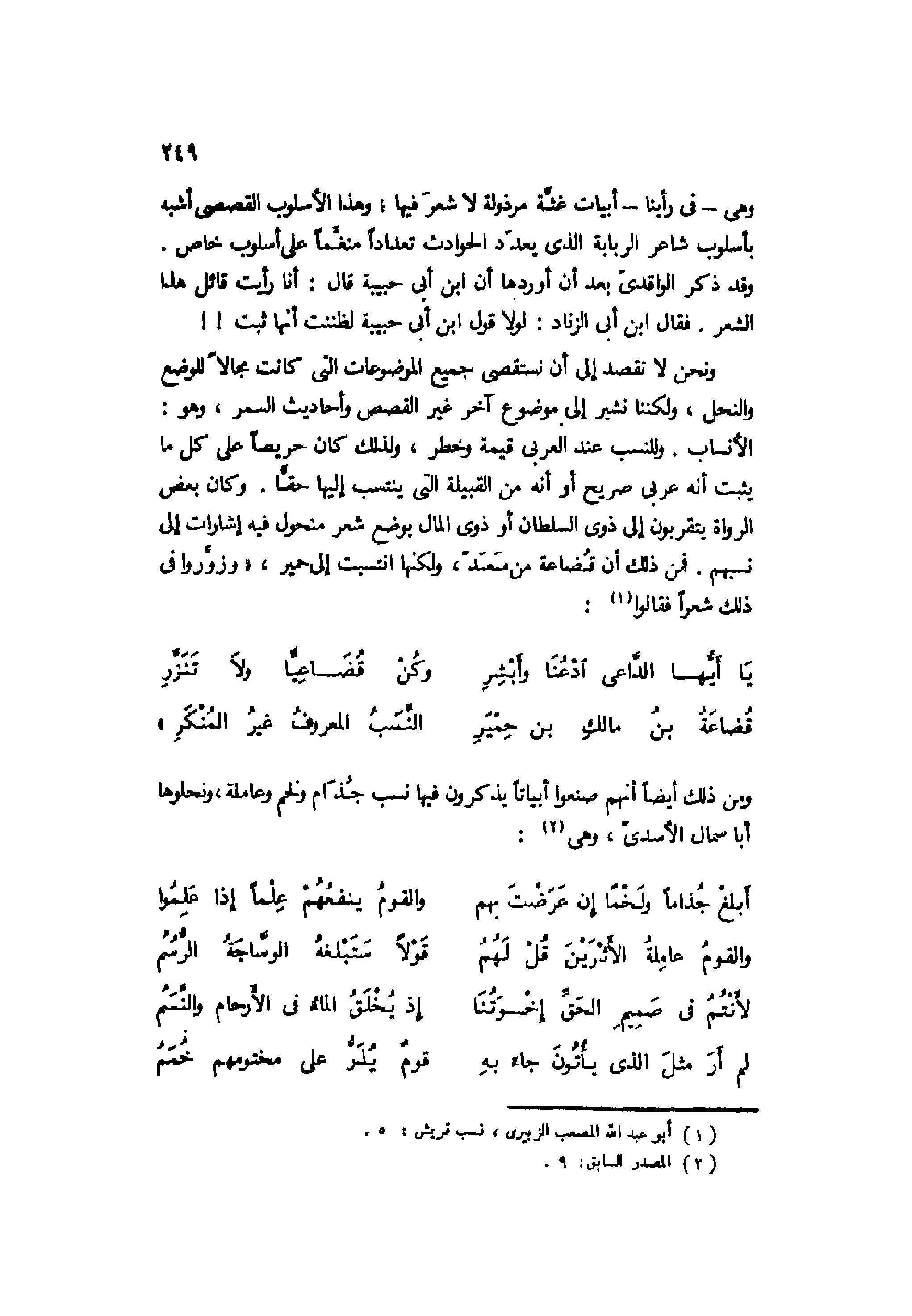 ونحن لا نقصد إلى أن نستقصي جميع الموضوعات التي كانت مجالًا للوضع والنحل، ولكننا نشير إلى موضوع آخر غير القصص وأحاديث السمر، وهو: الأنساب. وللنسب عند العربي قيمة وخطر، ولذلك كان حريصًا على كل ما يثبت أنه عربي صريح أو أنه من القبيلة التي ينتسب إليها حقًّا. وكان بعض الرواة يتقربون إلى ذوي السلطان أو ذوي المال بوضع شعر منحول فيه إشارات إلى نسبهم. فمن ذلك أن قضاعة من معد، ولكنها انتسبت إلى حمير، وزوروا في ذلك شعرًا فقالوا1: