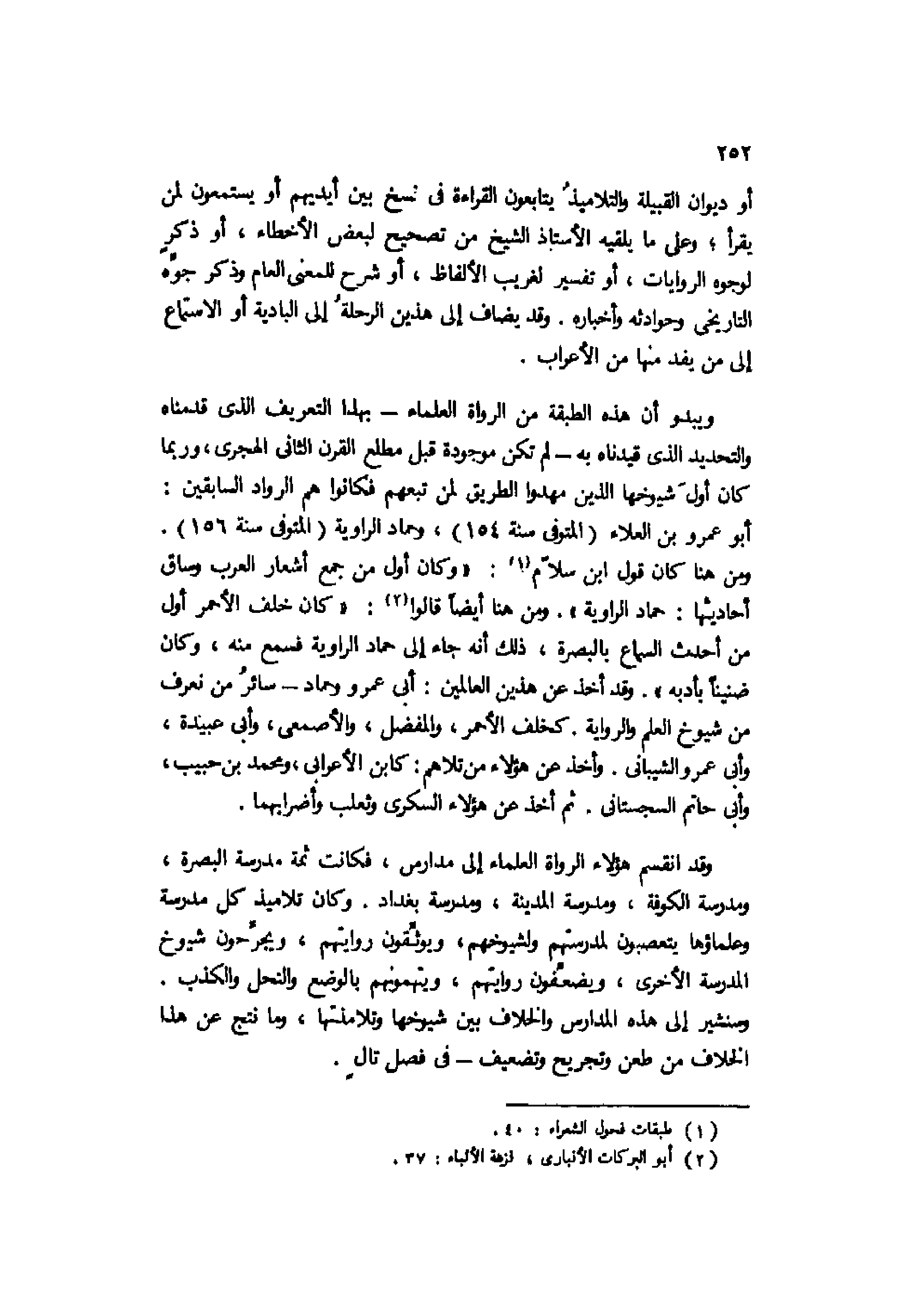 ومن هنا كان قول ابن سلام1: "وكان أول من جمع أشعار العرب وساق أحاديثها: حماد الراوية". ومن هنا أيضًا قالوا2: "كان خلف الأحمر أول من أحدث السماع بالبصرة، ذلك أنه جاء إلى حماد الراوية فسمع منه، وكان ضنينًا بأدبه". وقد أخذ عن هذين العالمين: أبي عمرو وحماد سائر من نعرف من شيوخ العلم والرواية كخلف الأحمر، والمفضل، والأصمعي، وأبي عبيدة، وأبي عمرو الشيباني. وأخذ عن هؤلاء من تلاهم: كابن الأعرابي، ومحمد بن حبيب، وأبي حاتم السجستاني. ثم أخذ عن هؤلاء السكري وثعلب وأضرابهما.