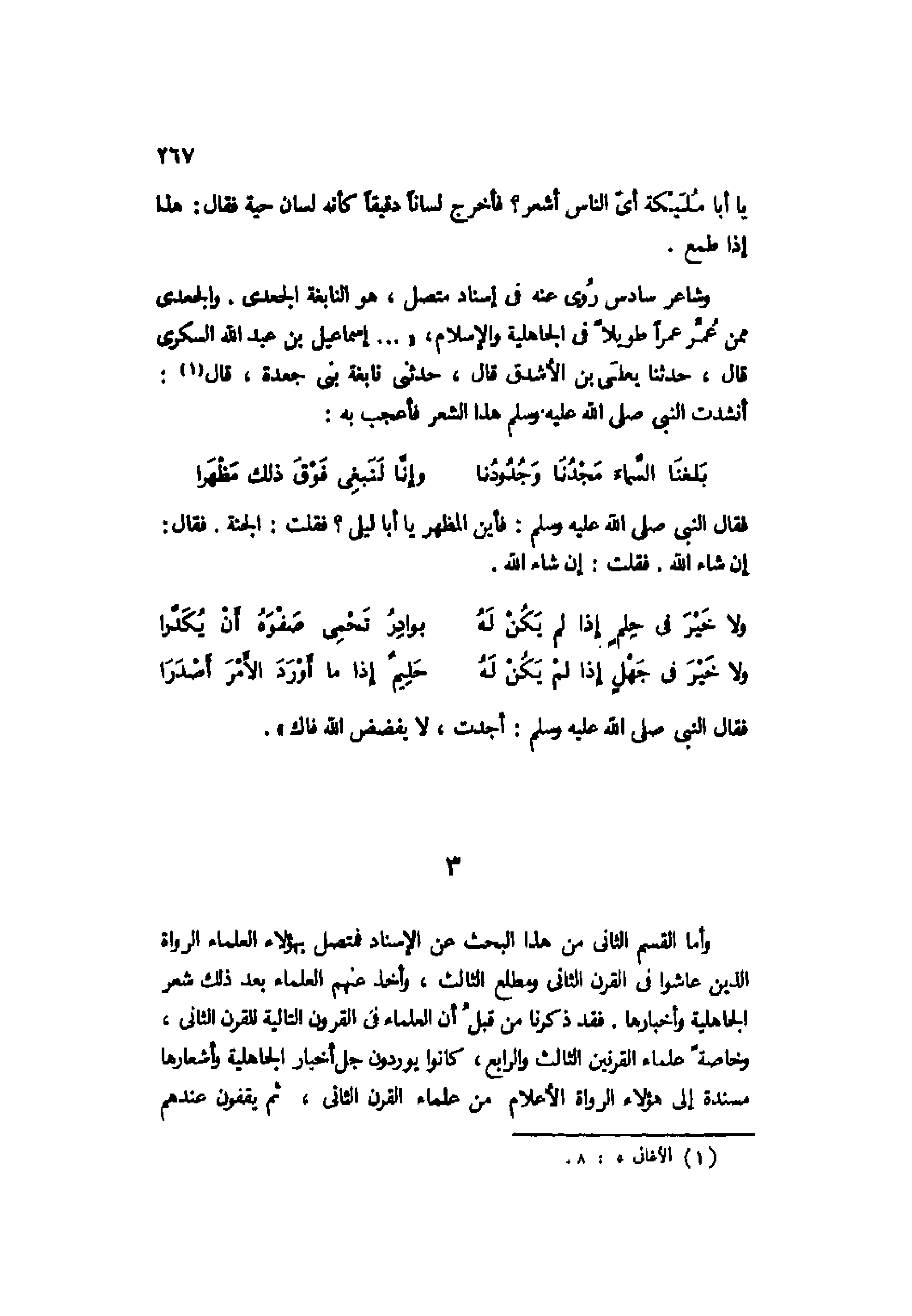 وأما القسم الثاني من هذا البحث عن الإسناد فمتصل بهؤلاء العلماء الرواة الذين عاشوا في القرن الثاني ومطلع الثالث، وأخذ عنهم العلماء بعد ذلك شعر الجاهلية وأخبارها. فقد ذكرنا من قبل أن العلماء في القرون التالية للقرن الثاني، وخاصة علماء القرنين الثالث والرابع، كانوا يوردون جل أخبار الجاهلية وأشعارها مسندة إلى هؤلاء الرواة الأعلام من علماء القرن الثاني، ثم يقفون عندهم