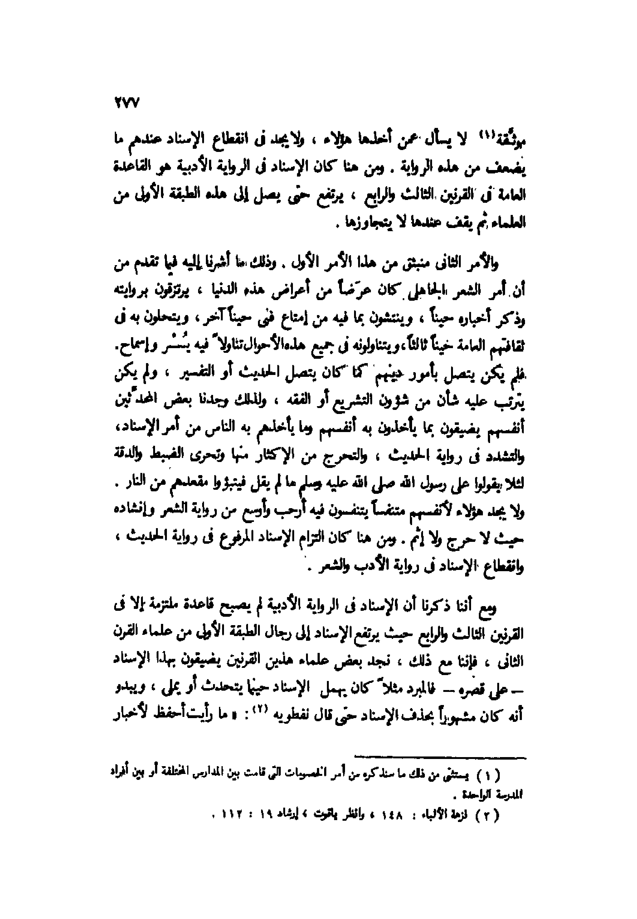 ومع أننا ذكرنا أن الإسناد في الرواية الأدبية لم يصبح قاعدة ملتزمة إلا في القرنين الثالث والرابع حيث يرتفع الإسناد إلى رجال الطبقة الأولى من علماء القرن الثاني، فإننا مع ذلك، نجد بعض علماء هذين القرنين يضيقون بهذا الإسناد الثاني -على قصره- فالمبرد مثلًا كان يهمل الإسناد حينما يتحدث أو يملي، ويبدو أنه كان مشهورًا بحذف الإسناد حتى قال نفطويه2: "ما رأيت أحفظ لأخبار