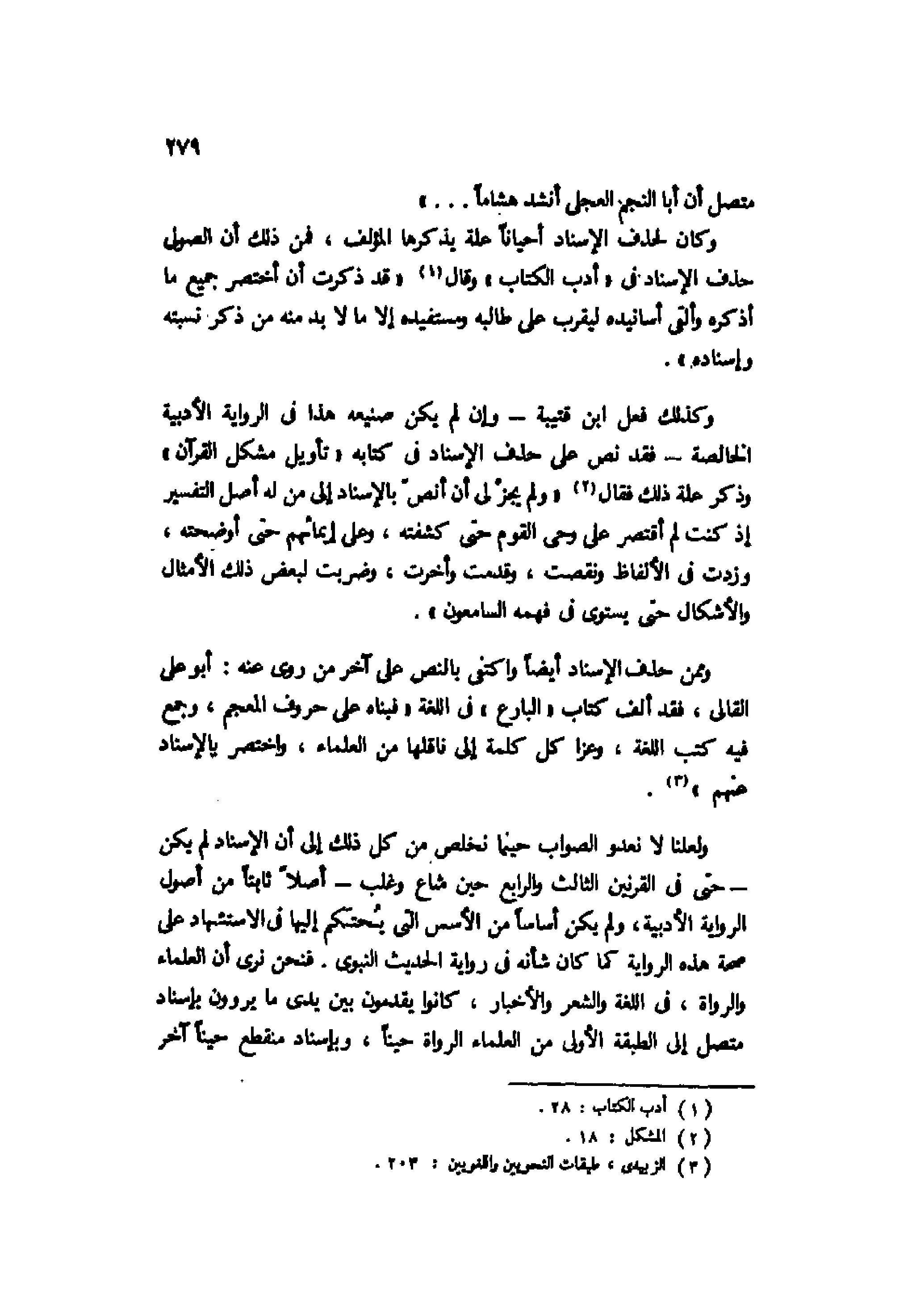 وكذلك فعل ابن قتيبة -وإن لم يكن صنيعه هذا في الرواية الأدبية الخالصة- فقد نص على حذف الإسناد في كتابه "تأويل مشكل القرآن" وذكر علة ذلك فقال2 "ولم يجز لي أن أنص بالإسناد إلى من له أصل التفسير إذ كنت لم أقتصر على وحي القوم حتى كشفته، وعلى إيمائهم حتى أوضحته، وزدت في الألفاظ ونقصت، وقدمت وأخرت، وضربت لبعض ذلك الأمثال والأشكال حتى يستوي في فهمه السامعون".