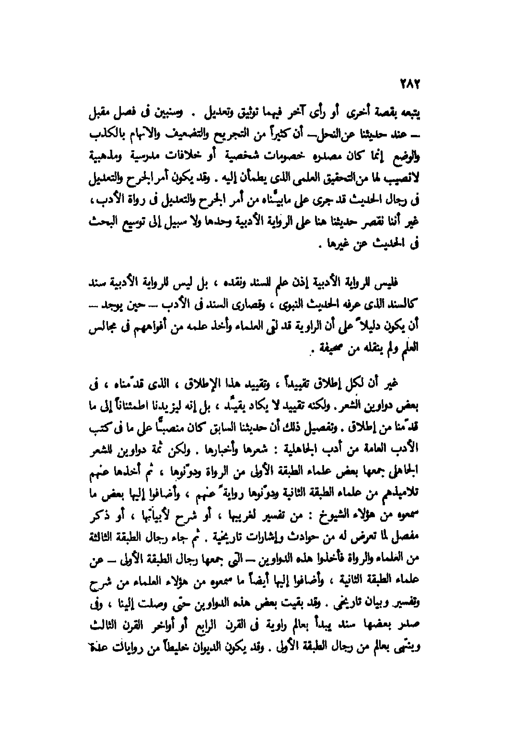 فليس للرواية الأدبية إذن علم للسند ونقده، بل ليس للرواية الأدبية سند كالسند الذي عرفه الحديث النبوي، وقصارى السند في الأدب -حين يوجد- أن يكون دليلًا على أن الراوية قد لقي العلماء وأخذ علمه من أفواههم في مجالس العلم ولم ينقله من صحيفة.