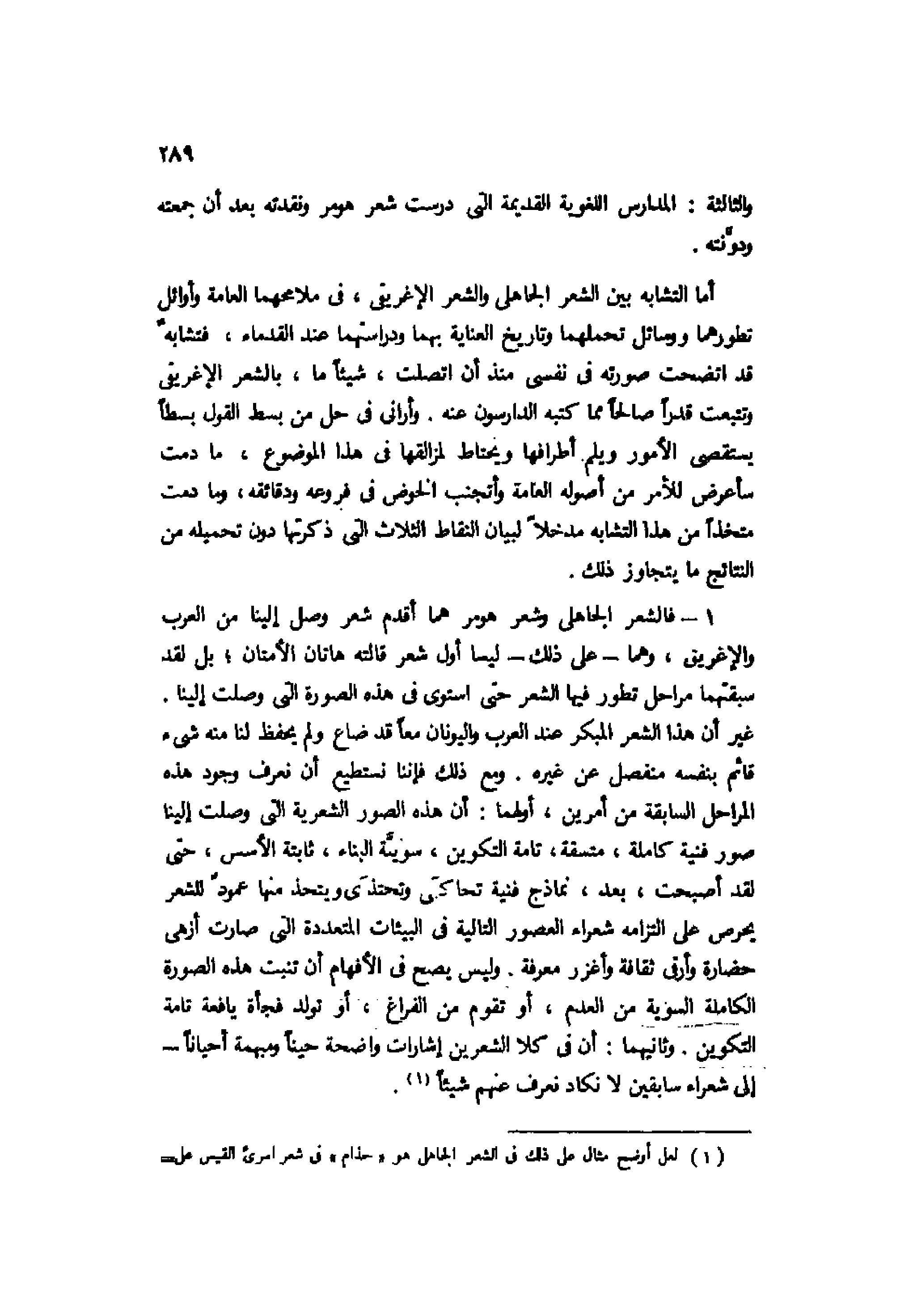 1- فالشعر الجاهلي وشعر هومر هما أقدم شعر وصل إلينا من العرب والإغريق، وهما -على ذلك- ليسا أول شعر قالته هاتان الأمتان؛ بل لقد سبقتهما مراحل تطور فيها الشعر حتى استوى في هذه الصورة التي وصلت إلينا. غير أن هذا الشعر المبكر عند العرب واليونان معًا قد ضاع ولم يحفظ لنا منه شيء قائم بنفسه منفصل عن غيره. ومع ذلك فإننا نستطيع أن نعرف وجود هذه المراحل السابقة من أمرين، أولهما: أن هذه الصور الشعرية التي وصلت إلينا صور فنية كاملة، متسقة، تامة التكوين، سوية البناء، ثابتة الأسس، حتى لقد أصبحت، بعد، نماذج فنية تحاكى وتحتذى ويتحذ منها عمود للشعر يحرص على التزامه شعراء العصور التالية في البيئات المتعددة التي صارت أزهى حضارة وأرقى ثقافة وأغزر معرفة. وليس يصح في الأفهام أن تنبت هذه الصورة الكاملة السوية من العدم، أو تقوم من الفراغ، أو تولد فجأة يافعة تامة التكوين. وثانيهما: أن في كلا الشعرين إشارات واضحة حينًا ومبهمة أحيانًا إلى شعراء سابقين لا نكاد نعرف عنهم شيئًا1.