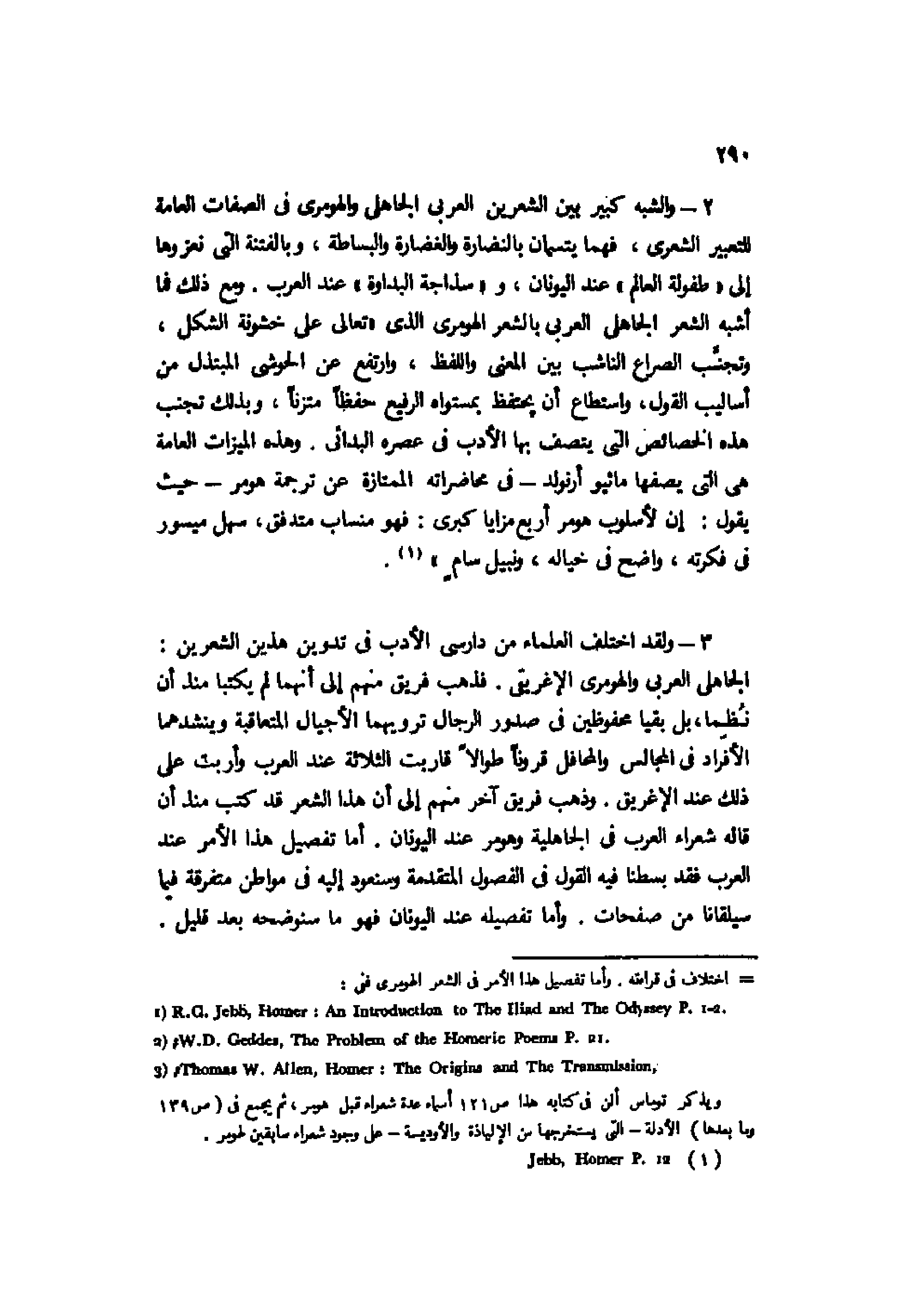2- والشبه كبير بين الشعرين العربي الجاهلي والهومري في الصفات العامة للتعبير الشعري، فهما يتسمان بالنضارة والغضارة والبساطة، وبالفتنة التي نعزوها إلى "طفولة العالم" عند اليونان، و"سذاجة البداوة" عند العرب. ومع ذلك فما أشبه الشعر الجاهلي العربي بالشعر الهومري الذي "تعالى عن خشونة الشكل، وتجنب الصراع الناشب بين المعنى واللفظ، وارتفع عن الحوشي المبتذل من أساليب القول، واستطاع أن يحتفظ بمستواه الرفيع حفظًا متزنًا، وبذلك تجنب هذه الخصائص التي يتصف بها الأدب في عصره البدائي. وهذه الميزات العامة هي التي يصفها ماثيو أرنولد -في محاضراته الممتازة عن ترجمة هومر- حيث يقول: إن لأسلوب هومر أربع مزايا كبرى: فهو منساب متدفق، سهل ميسور في فكرته، واضح في خياله، ونبيل سامٍ"1.