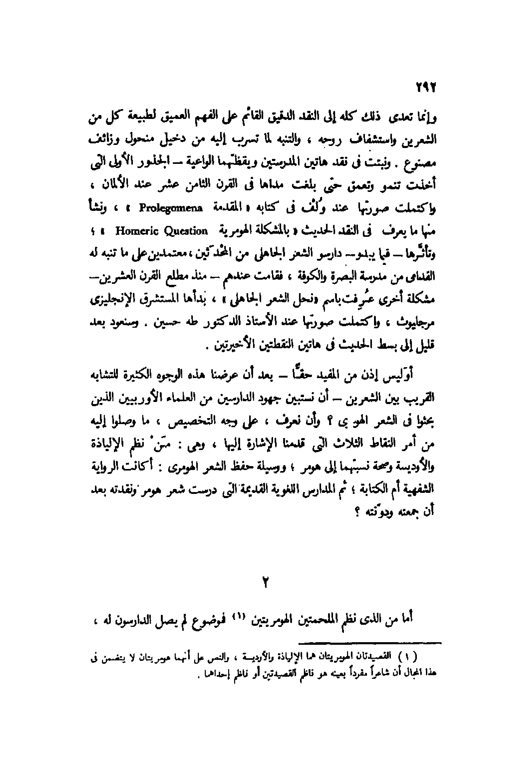 وإنما تعدى ذلك كله إلى النقد الدقيق القائم على الفهم العميق لطبيعة كل من الشعرين واستشفاف روح، والتنبه لما تسرب إليه من دخيل منحول وزائف مصنوع. ونبتت في نقد هاتين المدرستين ويقظتهما الواعية الجذور الأول التي أخذت تنمو وتعمق حتى بلغت مداها في القرن الثامن عشر عند الألمان، واكتملت صورتها عند ولف في كتابه "المقدمة Prolegomena"، ونشأ منها ما يعرف في النقد الحديث "بالمشكلة الهومرية Homeric Question"؛ وتأثرها -فيما يبدو- دارسو الشعر الجاهلي من المحدثين، معتمدين على ما تنبه له القدامى من مدرسة البصرة والكوفة، فقامت عندهم منذ مطلع القرن العشرين مشكلة أخرى عُرِفت باسم "نحل الشعر الجاهلي"، بدأها المستشرق الإنجليزي مرجليوث، واكتملت صورتها عند الأستاذ الدكتور طه حسين. وسنعود بعد قليل إلى بسط الحديث في هاتين النقطتين الأخيرتين.