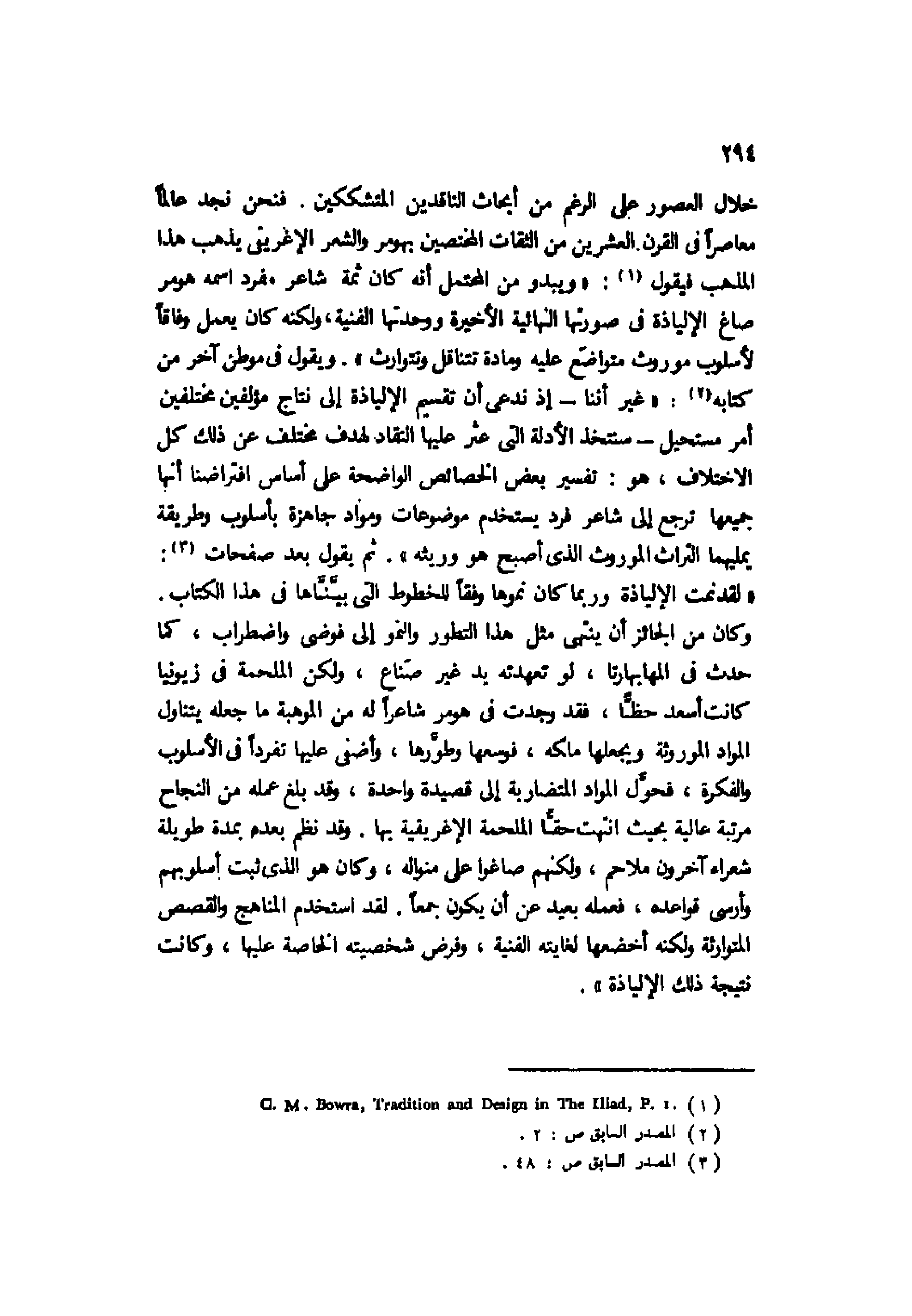 خلال العصور على الرغم من أبحاث الناقدين المتشككين. فنحن نجد عالمًا معاصرًا في القرن العشرين من الثقات المختصين بهومر والشعر الإغريقي يذهب هذا المذهب فيقول1: "ويبدو من المحتمل أنه كان ثمة شاعر مفرد اسمه هومر صاغ الإلياذة في صورتها النهائية الأخيرة ووحدتها الفنية، ولكنه كان يعمل وفاقًا لأسلوب موروث متواضع عليه ومادة تتناقل وتتوارث". ويقول في موطن آخر من كتابه2: "غير أننا إذ ندعي أن تقسيم الإلياذة إلى نتاج مؤلفين مختلفين أمر مستحيل سنتخذ الأدلة التي عثر عليها النقاد لهدف مختلف عن ذلك كل الاختلاف، هو: تفسير بعض الخصائص الواضحة على أساس افتراضنا أنها جميعها ترجع إلى شاعر فرد يستخدم موضوعات ومواد جاهزة بأسلوب وطريقة يمليها التراث الموروث الذي أصبح هو وريثه". ثم يقول بعد صفحات3: "لقد نمت الإلياذة وربما كان نموها وفقًا للخطوط التي بيناها في هذا الكتاب. وكان من الجائز أن ينتهي مثل هذا التطور والنمو إلى فوضى واضطراب، كما حدث في المهابهارتا، لو تعهدته يد غير صناع، ولكن الملحمة في زيونيا كانت أسعد حظًّا، فقد وجدت في هومر شاعرًا له من الموهبة ما جعله يتناول المواد الموروثة ويجعلها ملكه، فوسعها وطورها، وأضفى عليها تفردًا في الأسلوب والفكرة، فحول المواد المتضاربة إلى قصيدة واحدة، وقد بلغ عمله من النجاح مرتبة عالية بحيث انتهت حقًّا الملحمة الإغريقية بها. وقد نظم بعده بمدةٍ طويلة شعراء آخرون ملاحم، ولكنهم صاغوا على منواله، وكان هو الذي ثبت أسلوبهم وأرسى قواعده، فعمله بعيد عن أن يكون جمعًا. لقد استخدم المناهج والقصص المتوارثة ولكنه أخضعها لغايته الفنية، وفرض شخصيته الخاصة عليها، وكانت نتيجة ذلك الإلياذة".