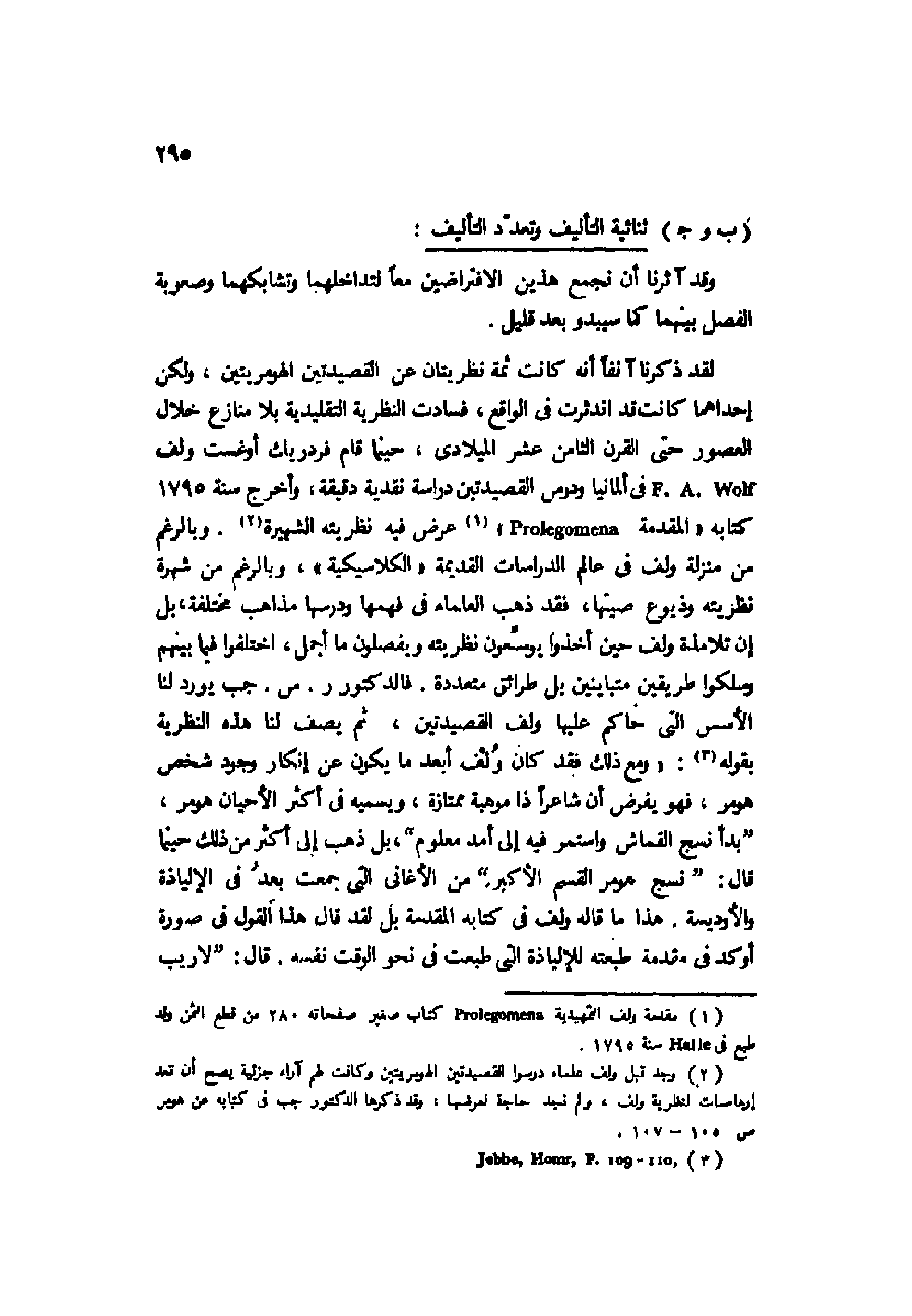 2 وجد قبل ولف علماء درسوا القصيدتين الهومريتين وكانت لهم آراء جزئية يصح أن تعد إرهاصات لنظرية ولف، ولم نجد حاجة لعرضها، وقد ذكرها الدكتور جب في كتابه عن هومر ص105-107.