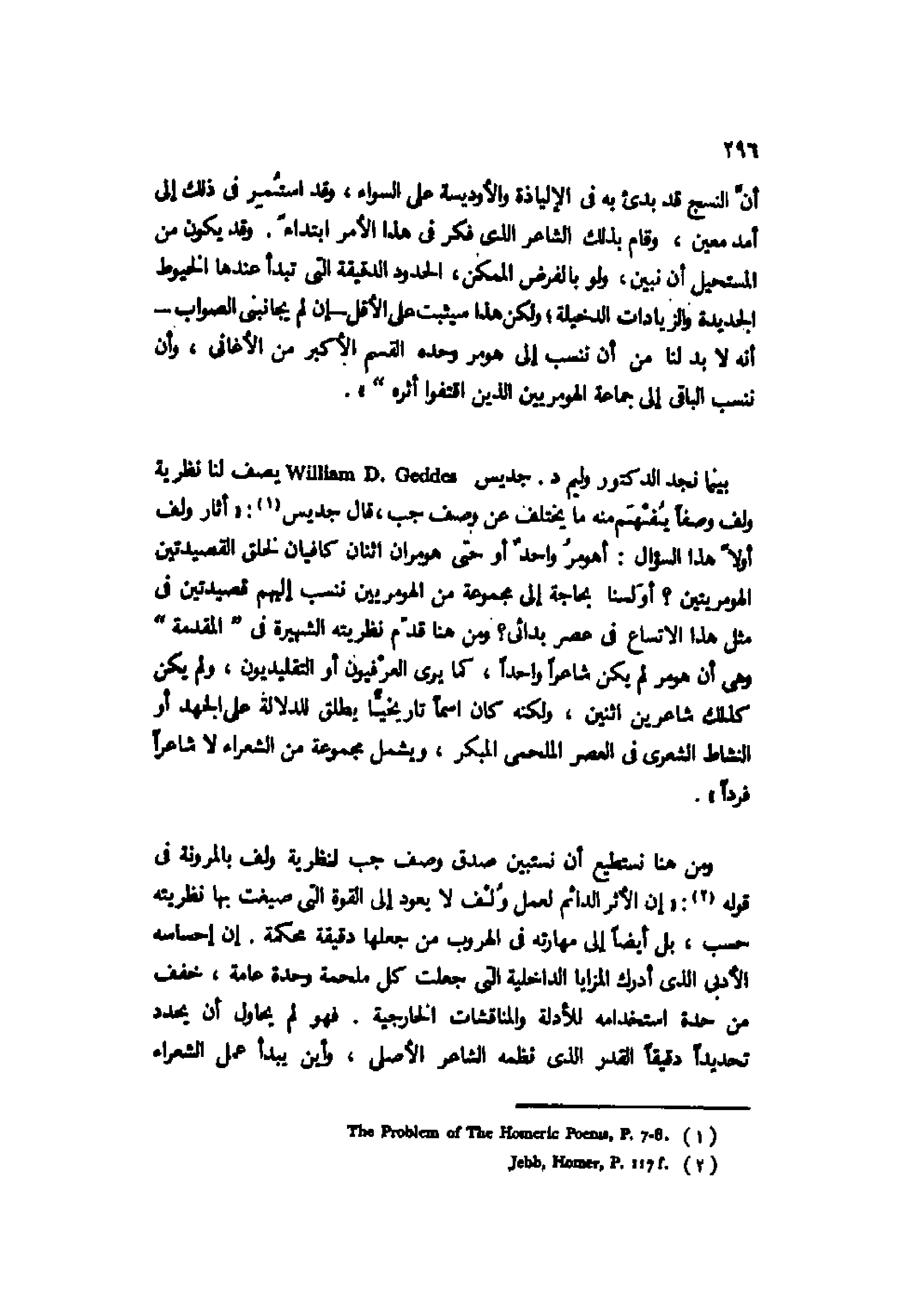 أن النسج قد بدئ به في الإلياذة والأوديسة على السواء، وقد استمر في ذلك إلى أمد معين، وقام بذلك الشاعر الذي فكر في هذا الأمر ابتداءً. وقد يكون من المستحيل أن نبين، ولو بالفرض الممكن، الحدود الدقيقة التي تبدأ عندها الخيوط الجديدة والزيادات الدخيلة؛ ولكن هذا سيثبت على الأقل -إن لم يجانبني الصواب- أنه لا بد لنا من أن ننسب إلى هومر وحده القسم الأكبر من الأغاني، وأن ننسب الباقي إلى جماعة الهومريين الذين اقتفوا أثره".