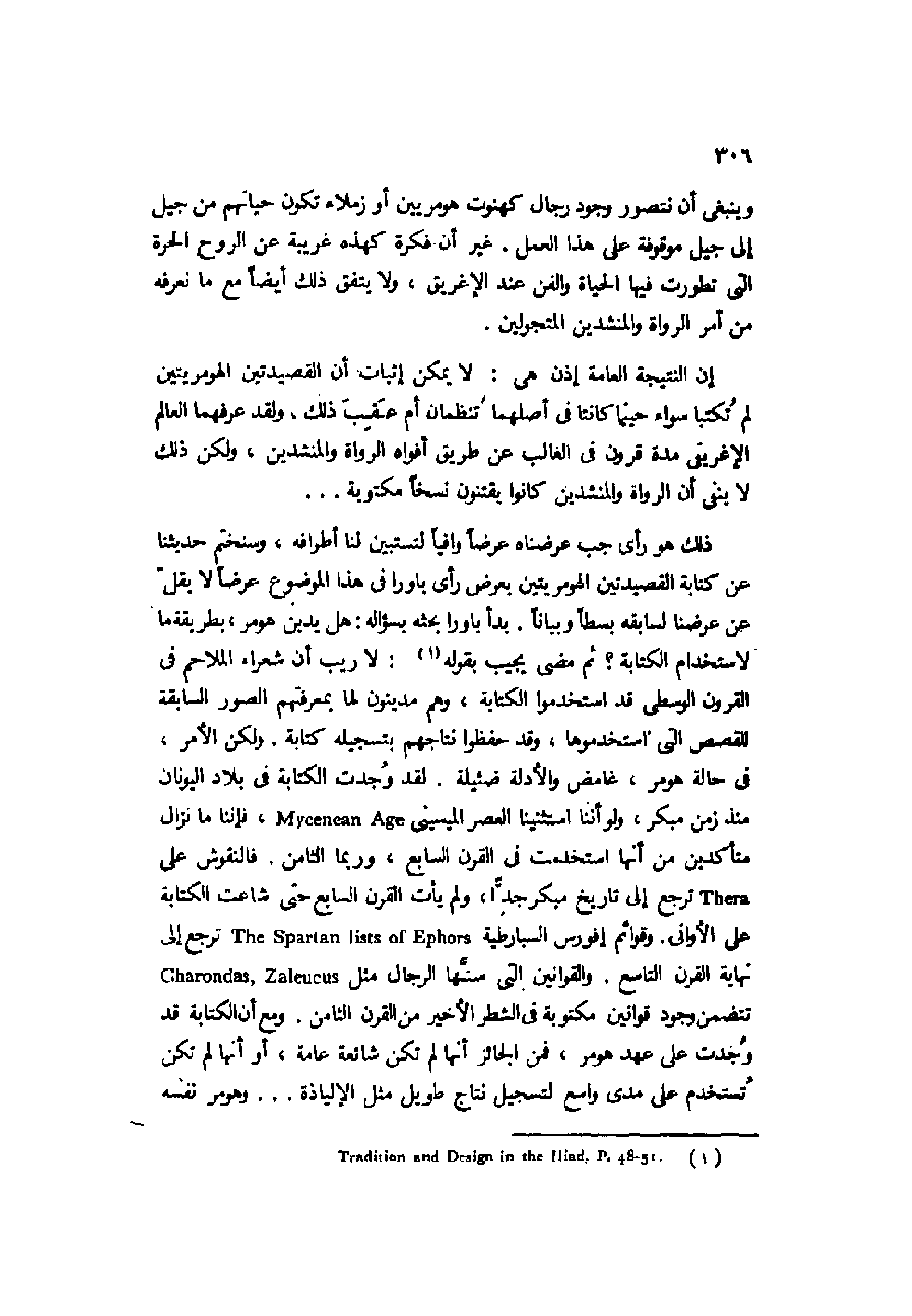 ذلك هو رأي جب عرضناه عرضًا وافيًا لتستبين لنا أطرافه، وسنختم حديثنا عن كتابة القصيدتين الهومريتين بعرض رأي باورا في هذا الموضوع عرضًا لا يقل عن عرضنا لسابقه بسطًا وبيانًا. بدأ باورا بحثه بسؤاله: هل يدين هومر، بطريقة ما لاستخدام الكتابة؟ ثم مضى يجيب بقوله1: لا ريب أن شعراء الملاحم في القرون الوسطى قد استخدموا الكتابة، وهم مدينون لها بمعرفتهم الصور السابقة للقصص التي استخدموها، وقد حفظوا نتاجهم بتسجيله كتابة. ولكن الأمر، في حالة هومر، غامض والأدلة ضئيلة. لقد وُجدت الكتابة في بلاد اليونان منذ زمن مبكر، ولو أننا استثنينا العصر الميسيني Mycenean Age، فإننا ما نزال متأكدين من أنها استخدمت في القرن السابع، وربما الثامن. فالنقوش على thera ترجع إلى تاريخ مبكر جدًّا، ولم يأت القرن السابع حتى شاعت الكتابة على الأواني. وقوائم إفورس السبارطية The Spartan lists of Ephorsترجع إلى نهاية القرن التاسع. والقوانين التي سنها الرجال مثل Charondas, Zaleucus تتضمن وجود قوانين مكتوبة في الشطر الأخير من القرن الثامن. ومع أن الكتابة قد وُجدت على عهد هومر، فمن الجائز أنها لم تكن شائعة عامة، أو أنها لم تكن تُستخدم على مدى واسع لتسجيل نتاج طويل مثل الإلياذة ... وهومر نفسه