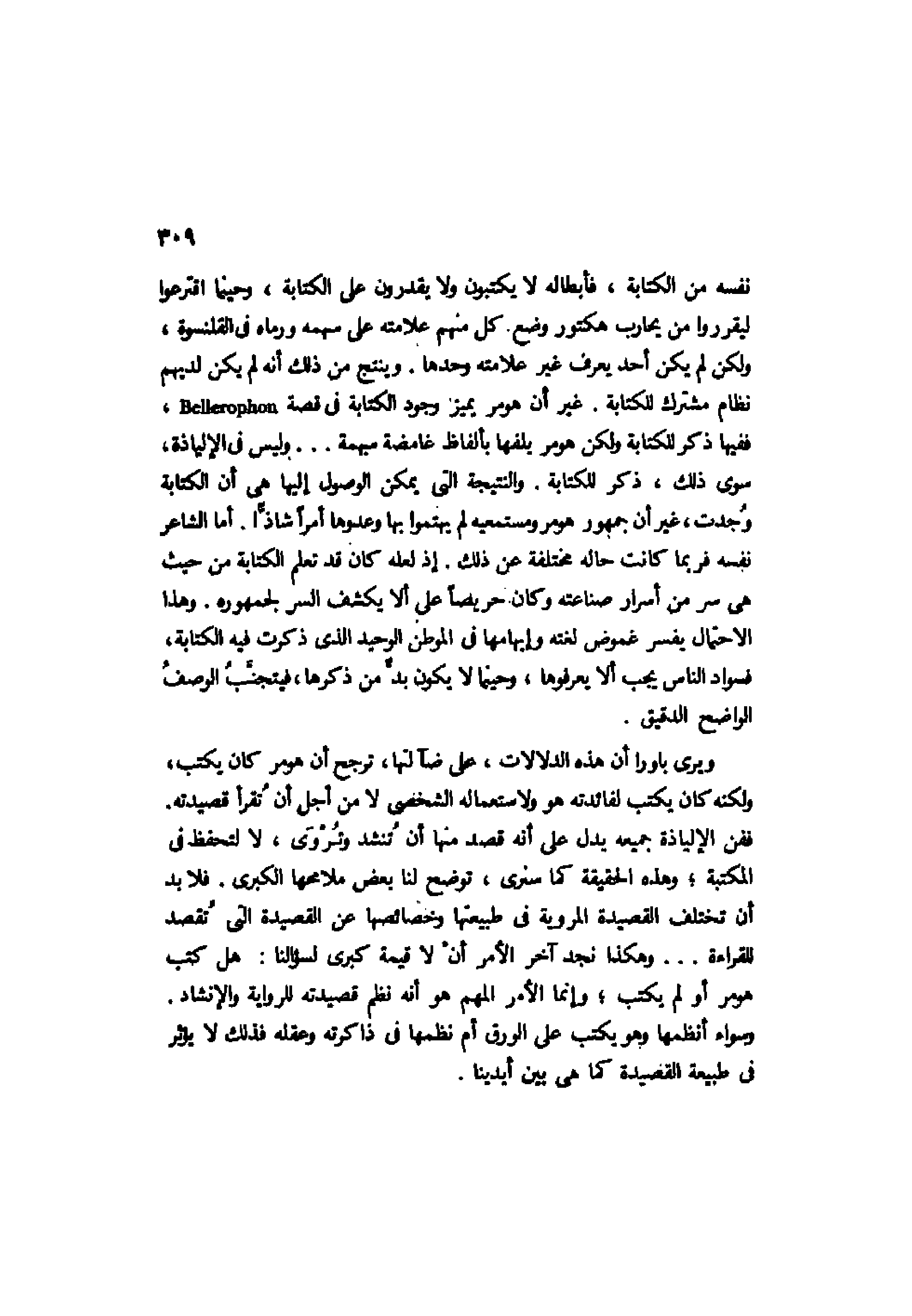 نفسه من الكتابة، فأبطاله لا يكتبون ولا يقدرون على الكتابة، وحينما اقترعوا ليقرروا من يحارب هكتور وضع كل منهم علامته على سهمه ورماه في القلنسوة، ولكن لم يكن أحد يعرف غير علامته وحدها. وينتج من ذلك أنه لم يكن لديهم نظام مشترك للكتابة. غير أن هومر يميز وجود الكتابة في قصة Bellerophon، ففيها ذكر للكتابة ولكن هومر يلفها بألفاظ غامضة مبهمة ... وليس في الإلياذة، سوى ذلك، ذكر للكتابة. والنتيجة التي يمكن الوصول إليها هي أن الكتابة وُجدت، غير أن جمهور هومر ومستمعيه لم يهتموا بها وعدوها أمرًا شاذًّا. أما الشاعر نفسه فربما كانت حاله مختلفة عن ذلك. إذ لعله كان قد تعلم الكتابة من حيث هي سر من أسرار صناعته وكان حريصًا على ألا يكشف السر لجمهوره. وهذا الاحتمال يفسر غموض لغته وإبهامها في الموطن الوحيد الذي ذكرت فيه الكتابة، فسواد الناس يجب ألا يعرفوها، وحينما لا يكون بد من ذكرها، فيتجنب الوصف الواضح الدقيق.