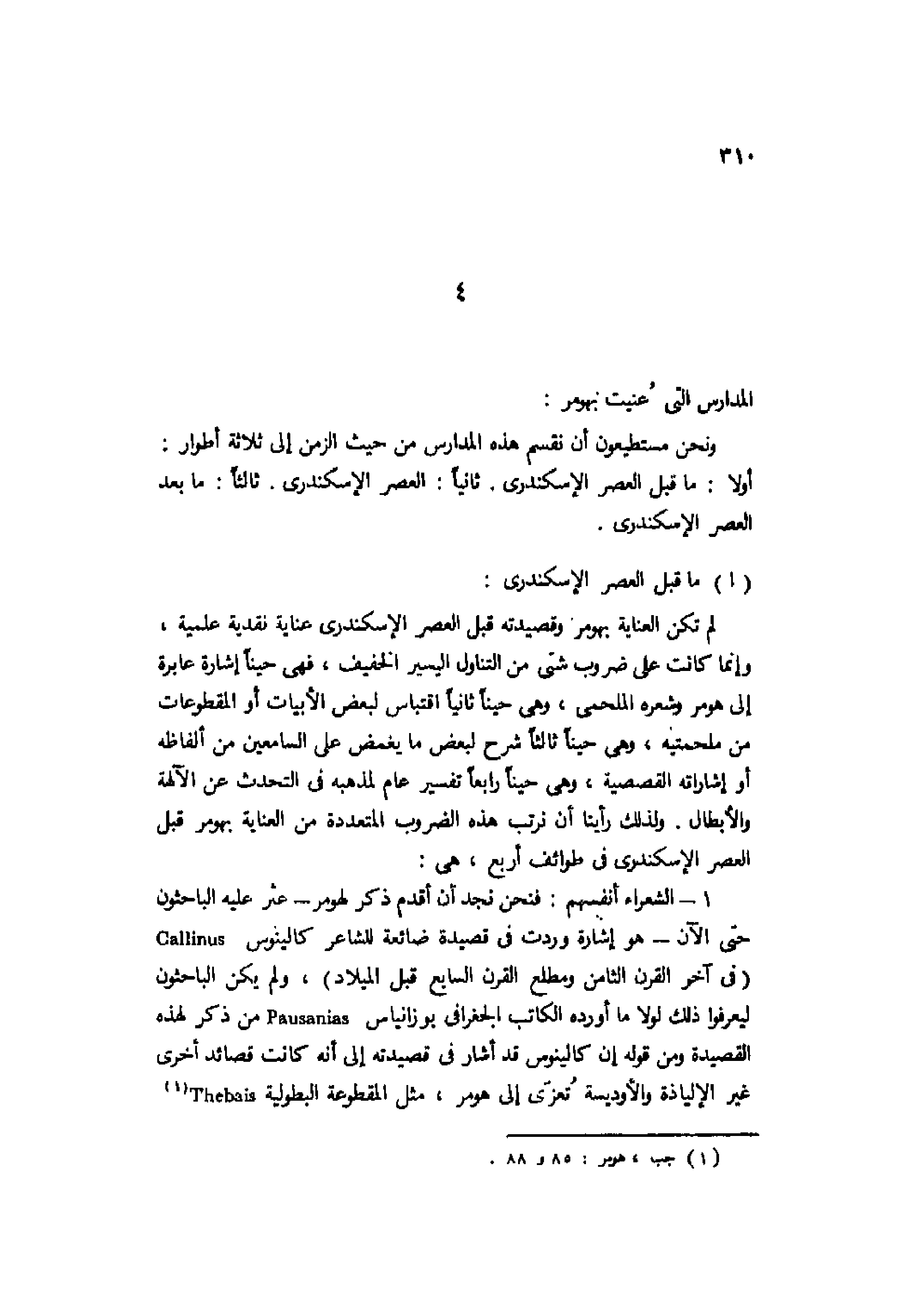 لم تكن العناية بهومر وقصيدته قبل العصر الإسكندري عناية نقدية علمية، وإنما كانت على ضروب شتى من التناول اليسير الخفيف، فهي حينًا إشارة عابرة إلى هومر وشعره الملحمي، وهي حينًا ثانيًا اقتباس لبعض الأبيات أو المقطوعات من ملحمتيه، وهي حينًا ثالثًا شرح لبعض ما يغمض على السامعين من ألفاظه أو إشاراته القصصية، وهي حينًا رابعًا تفسير عام لمذهبه في التحدث عن الآلهة والأبطال. ولذلك رأينا أن نرتب هذه الضروب المتعددة من العناية بهومر قبل العصر الإسكندري في طوائف أربع، هي: