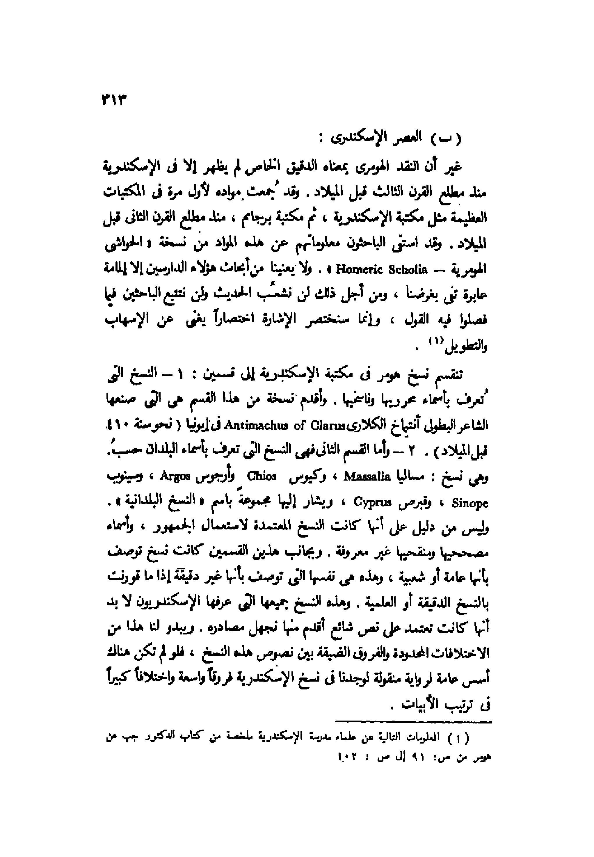 1 المعلومات التالية عن علماء مدرسة الإسكندرية ملخصة من كتاب الدكتور جب عن هومر من ص91 إلى ص102.