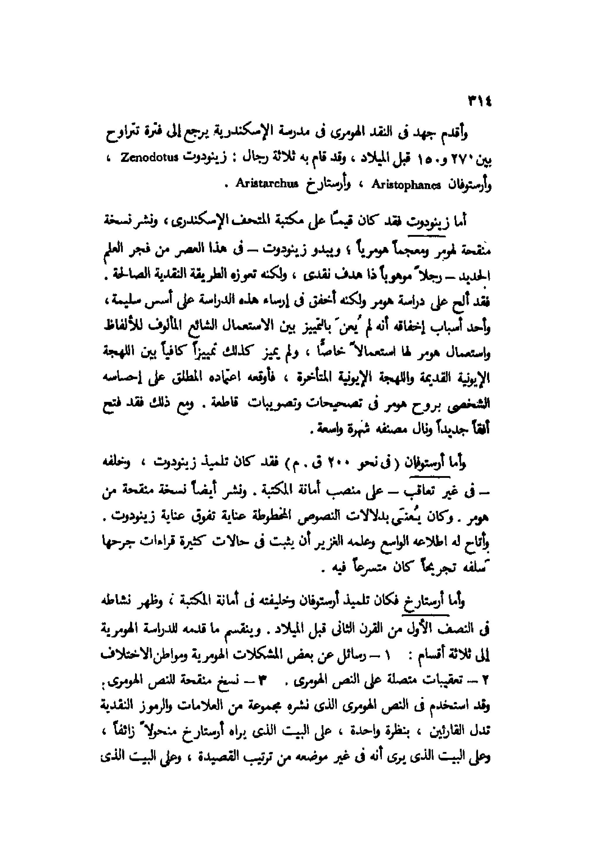 وأقدم جهد في النقد الهومري في مدرسة الإسكندرية يرجع إلى فترة تتراوح بين 270و 150 قبل الميلاد، وقد قام به ثلاثة رجال: زينودوت Zenodotus، وأرستوفان Aristophanes، وأرستارخ Aristarchus.