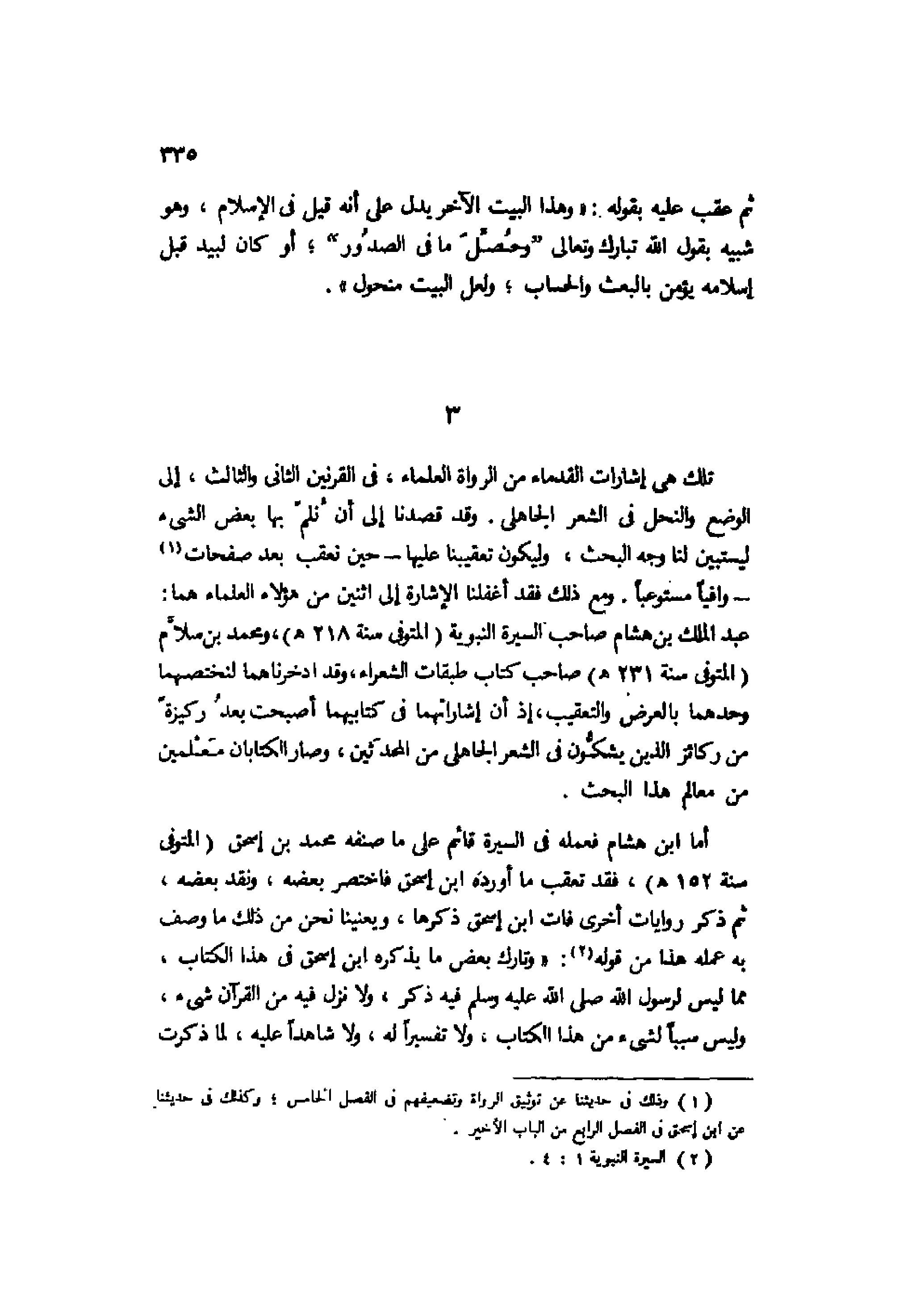 تلك هي إشارات القدماء من الرواة العلماء. في القرنين الثاني والثالث، إلى الوضع والنحل في الشعر الجاهلي. وقد قصدنا إلى أن نُلم بها بعض الشيء ليستبين لنا وجه البحث، وليكون تعقيبنا عليها -حين نعقب بعد صفحات1- وافيًا مستوعبًا. ومع ذلك فقد أغفلنا الإشارة إلى اثنين من هؤلاء العلماء هما: عبد الملك بن هشام صاحب السيرة النبوية "المتوفى سنة 218هـ"، ومحمد بن سلام "المتوفى سنة 231هـ" صاحب كتاب طبقات الشعراء، وقد ادخرناهما لنختصهما وحدهما بالعرض والتعقيب، إذ إن إشاراتهما في كتابيهما أصبحت بعدُ ركيزةً من ركائز الذين يشكون في الشعر الجاهلي من المحدثين، وصار الكتابان معلمين من معالم هذا البحث.
