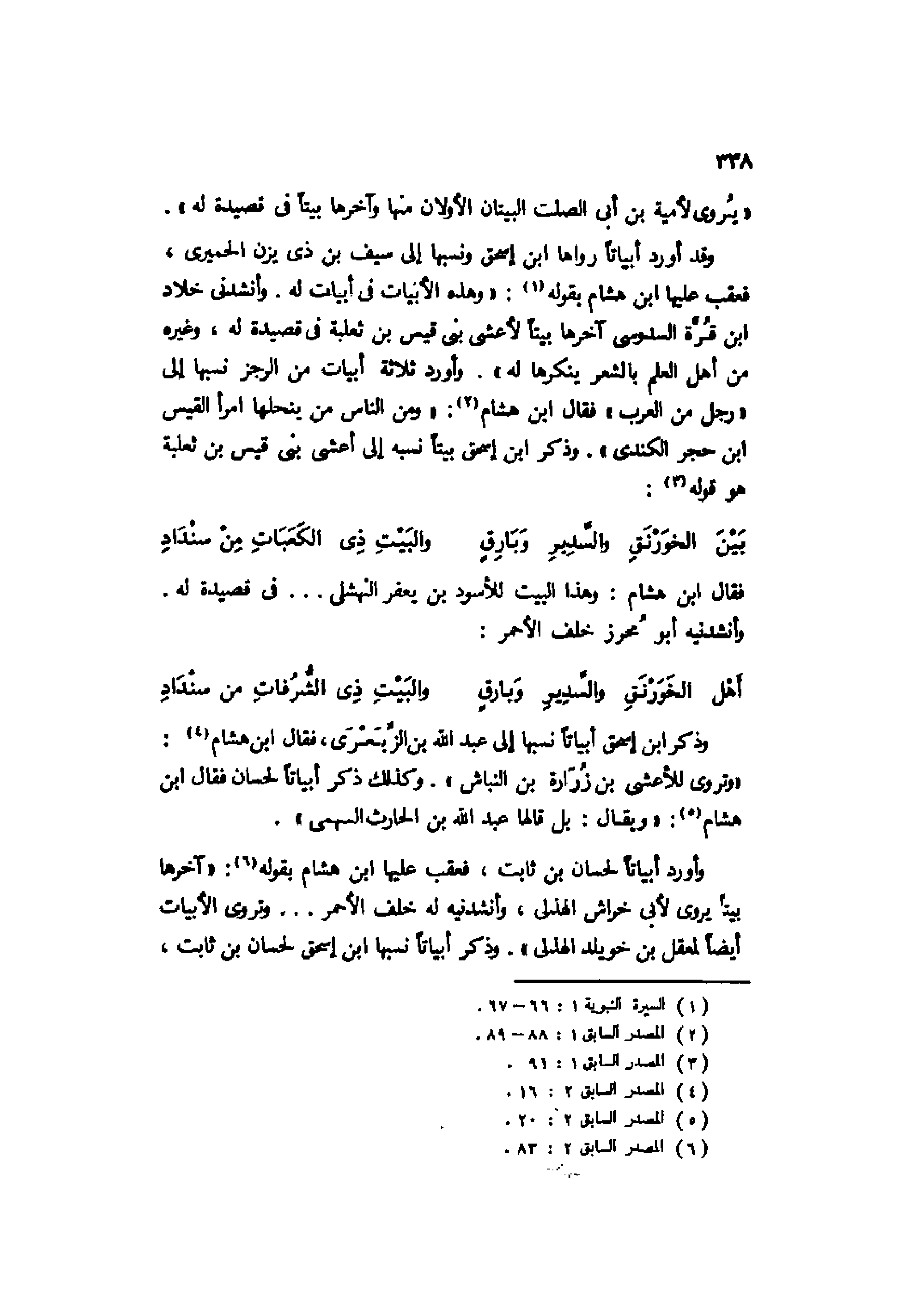 "وتُروى للأعشى بن زرارة بن النباش". وكذلك ذكر أبياتًا لحسان فقال ابن هشام5: "ويقال: بل قالها عبد الله بن الحارث السهمي".