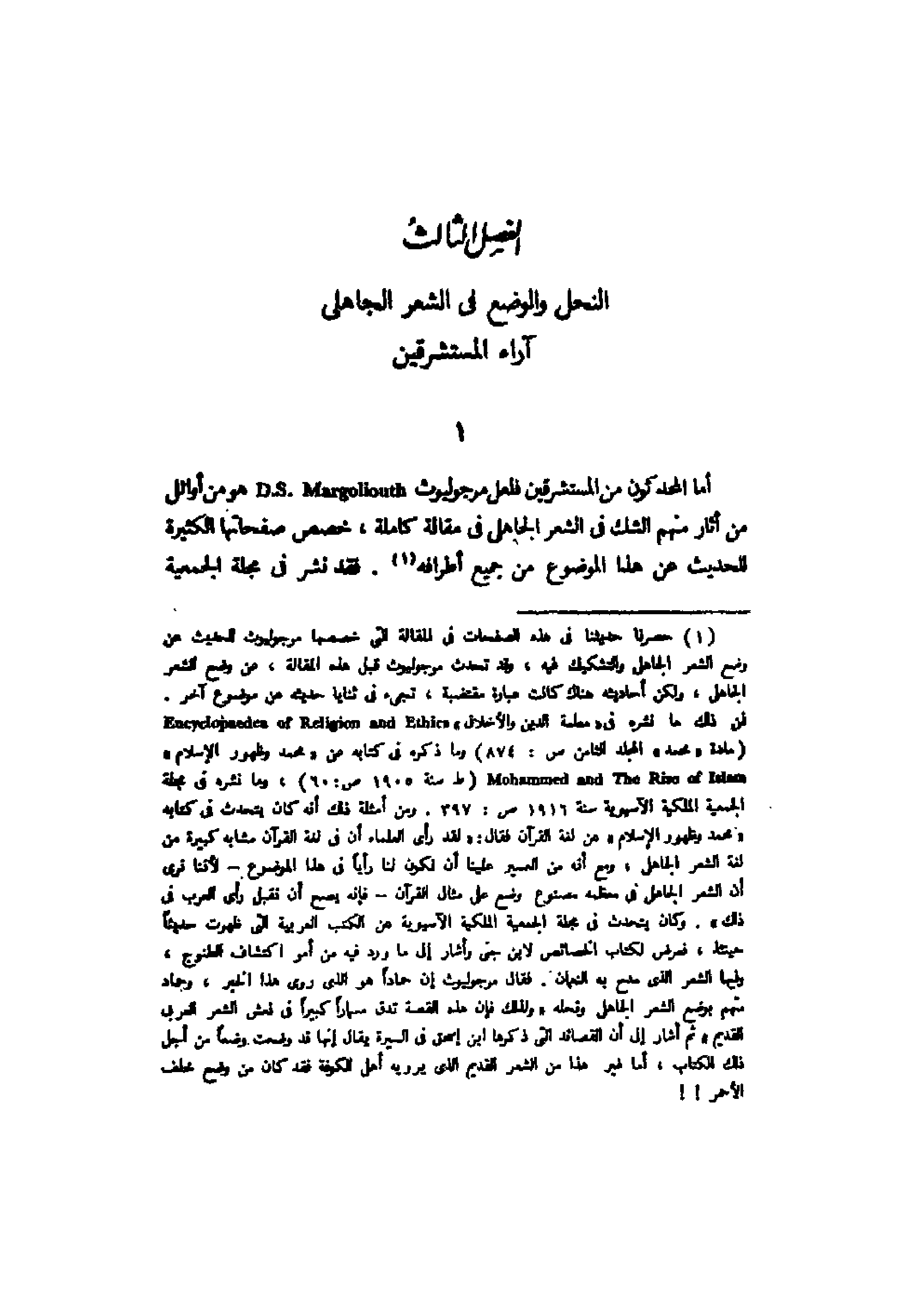 1 حصرنا حديثنا في هذه الصفحات في المقالة التي خصصها مرجوليوث للحديث عن وضع الشعر الجاهلي والتشكيك فيه، وقد تحدث مرجوليوث قبل هذه المقالة، عن وضع الشعر الجاهلي، ولكن أحاديثه هناك كانت عبارة مقتضبة، تجيء في ثنايا حديثه عن موضوع آخر.